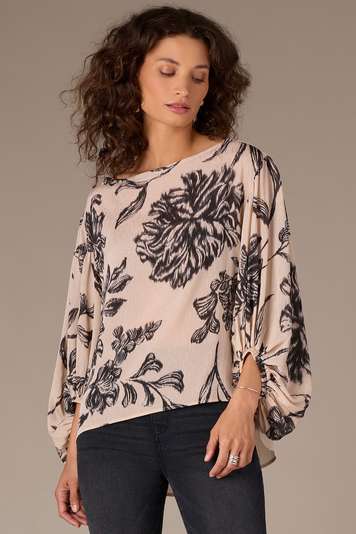 Banded Peasant Sleeve Boat Neck Floral Print Woven Top