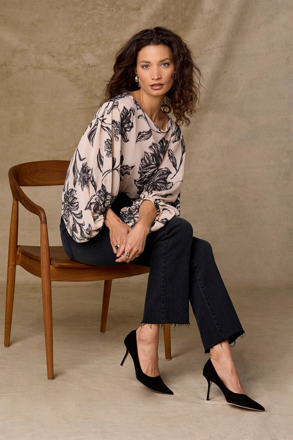 From morning coffee runs to date night, this woven top does it all. It has three quarter peasant sleeves with elastic bands, a boat neck, hi-low hem, and a modern floral print.