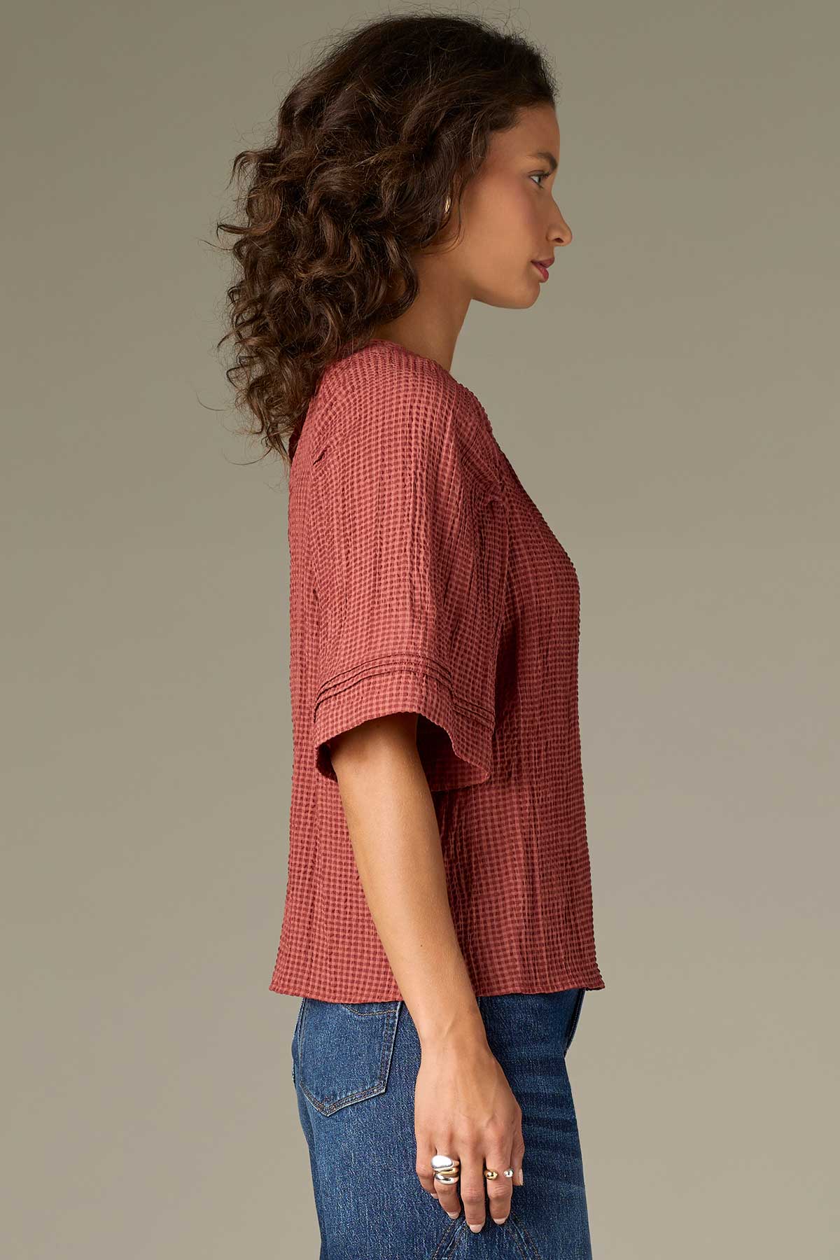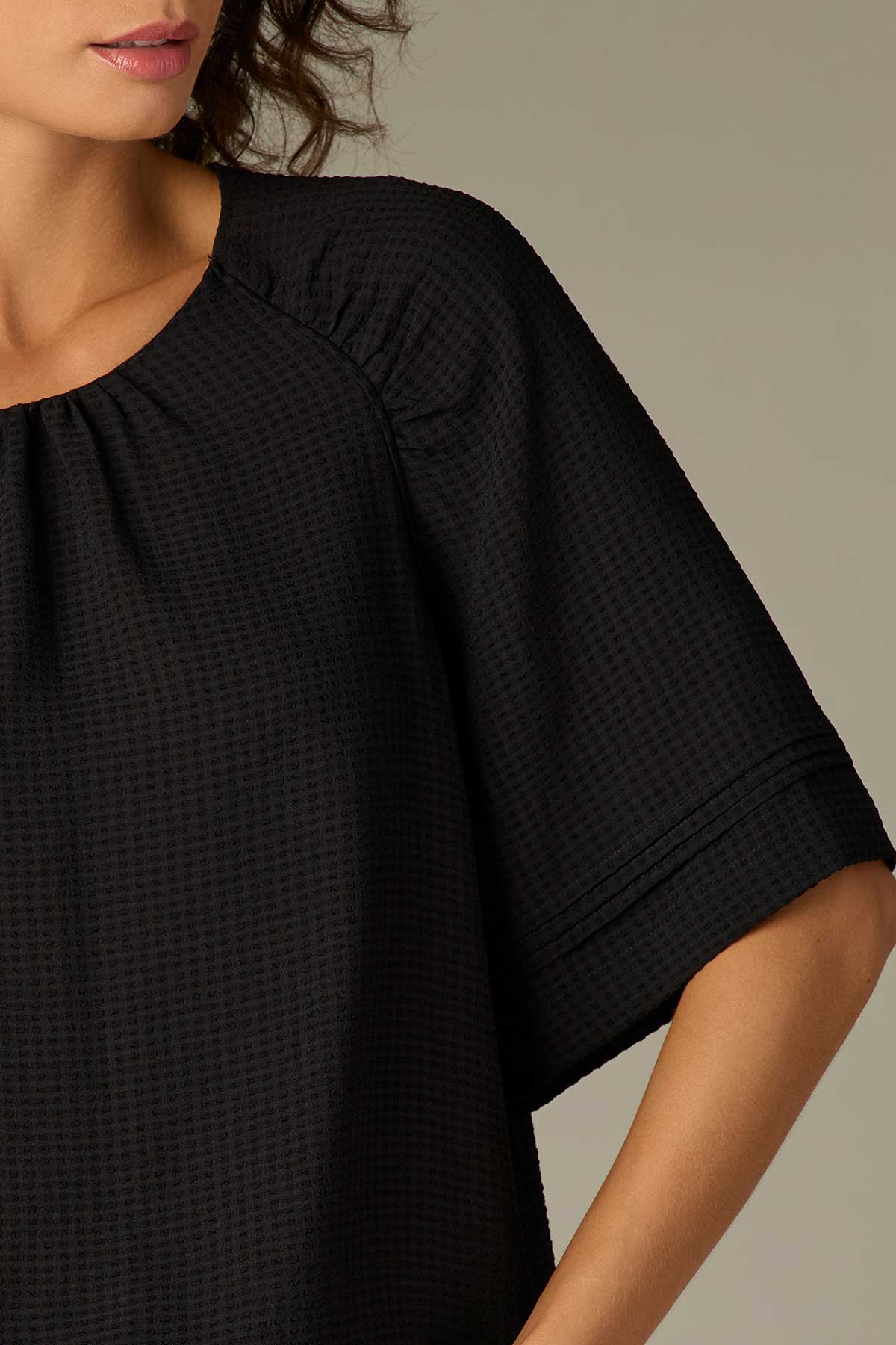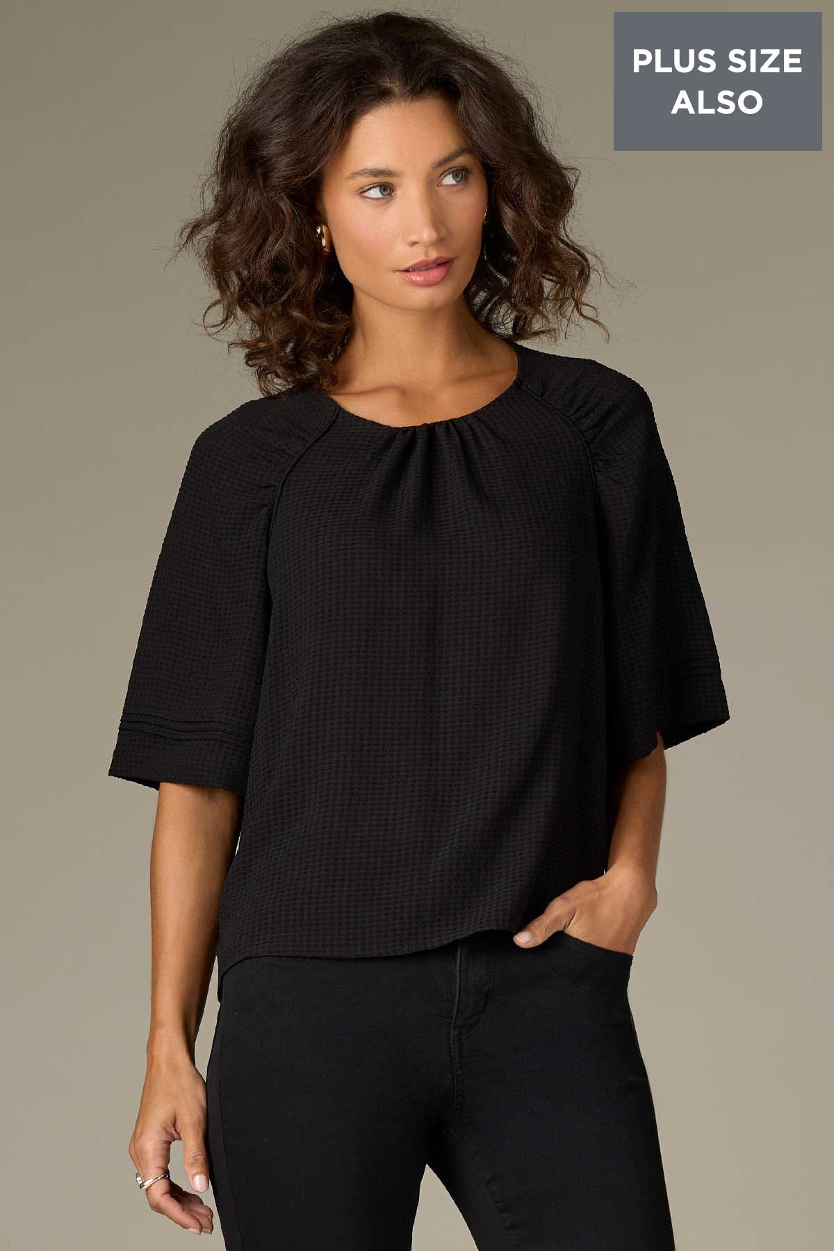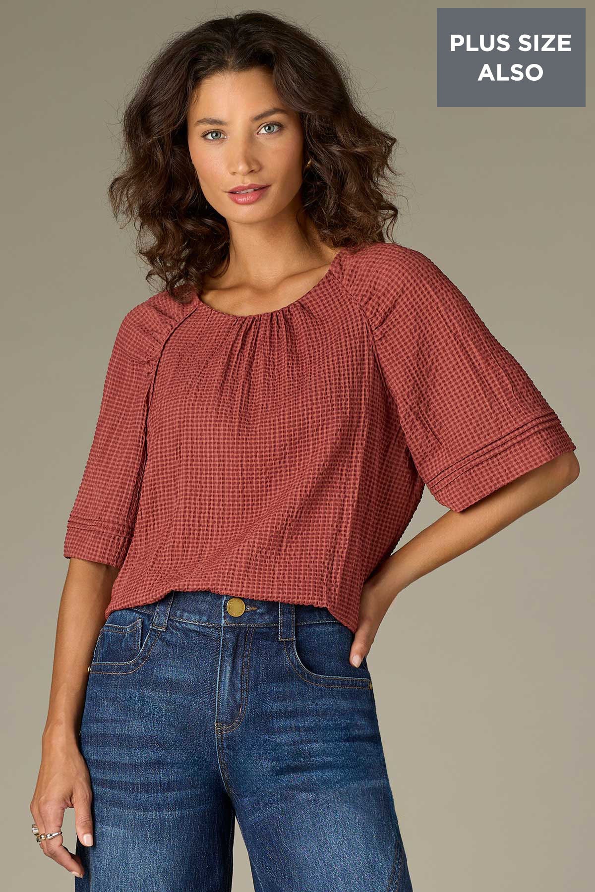 Add a pop of color and texture to your wardrobe with this woven top in plus sizing, designed with elbow raglan sleeves, a shirred scoop neck, and pintucking details. Pair it with everything from your favorite jeans to a polished pair of trousers.