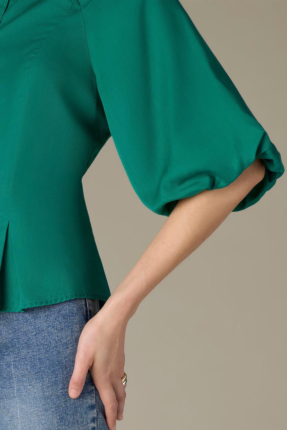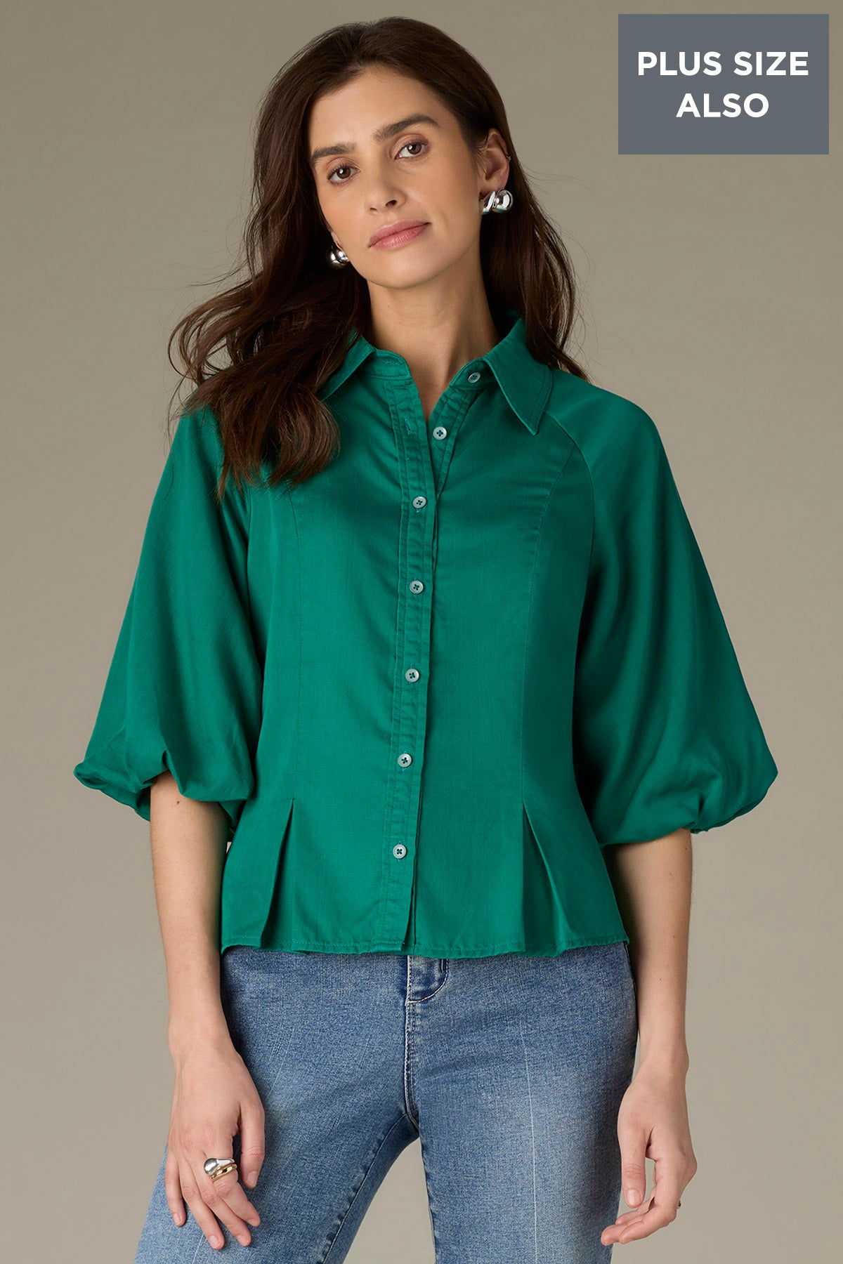 With below elbow bubble sleeves, a collar neck, button down front, and a dart peplum hem, this vibrant green woven lyocell top in plus sizing is a wardrobe essential. Pair it with jeans or trousers for an effortlessly put-together look.