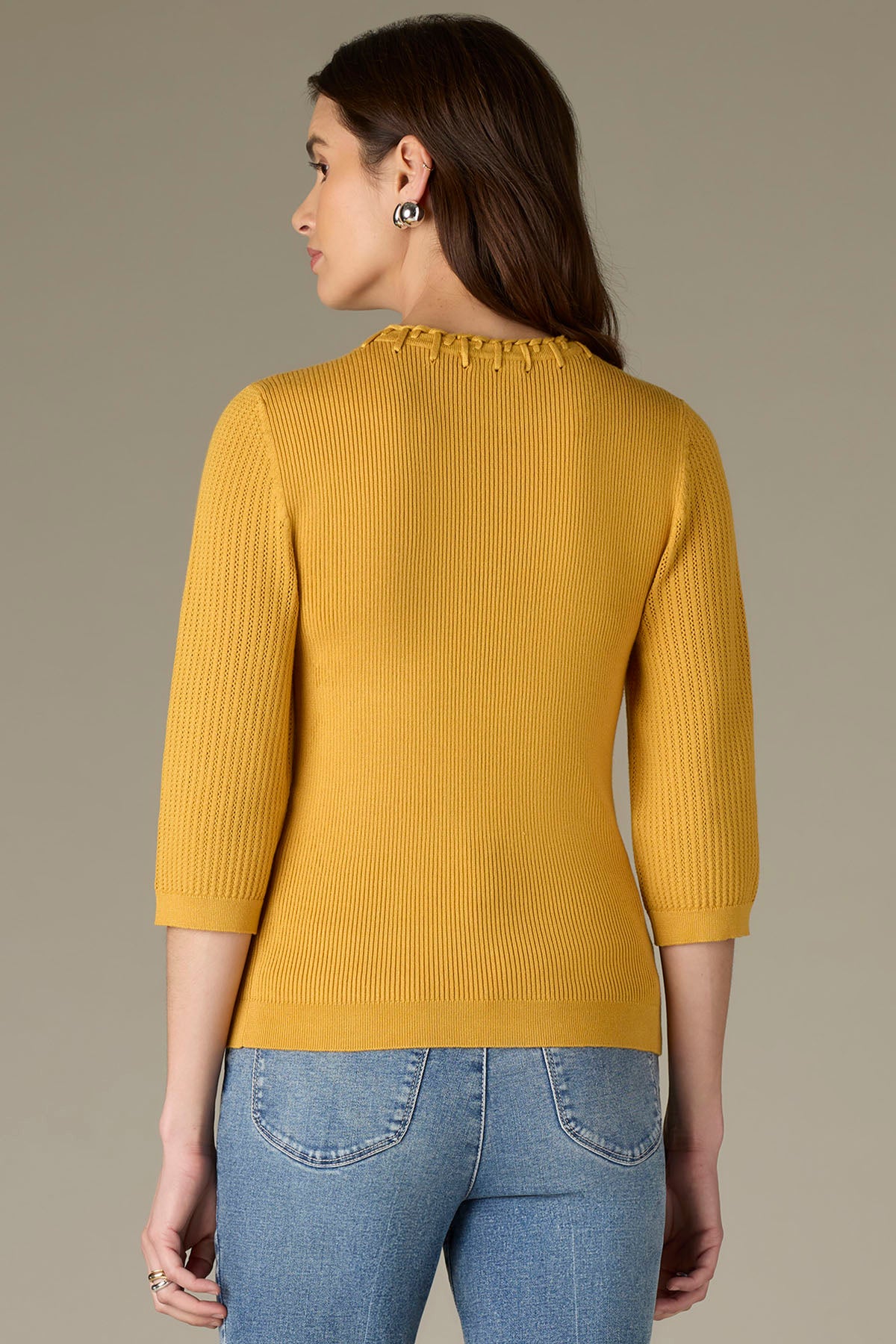 This ribbed sweater has below elbow sleeves, a round neck with whipstitch detailing, and a straight hem. Opt for a pop of color or a neutral color palette.