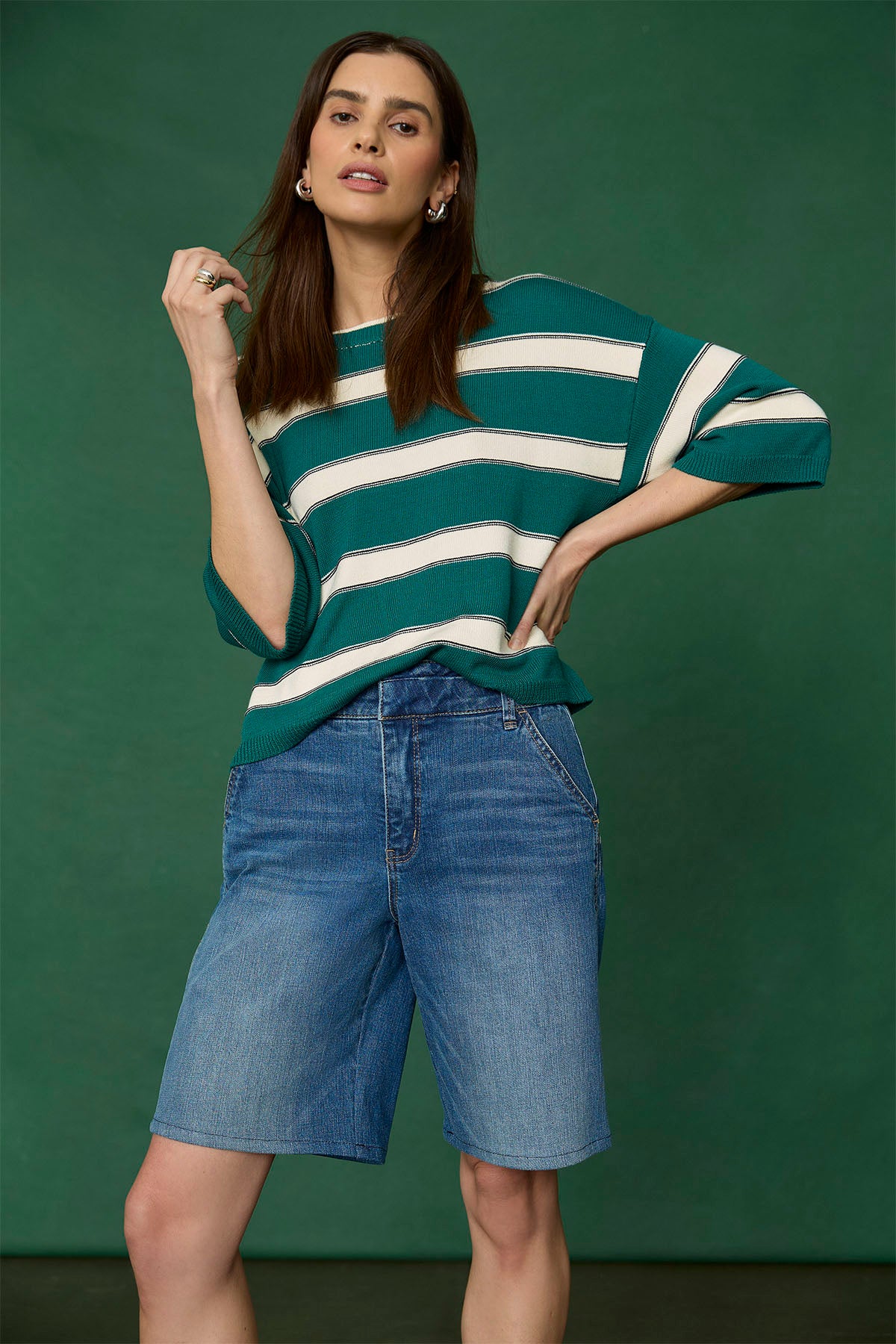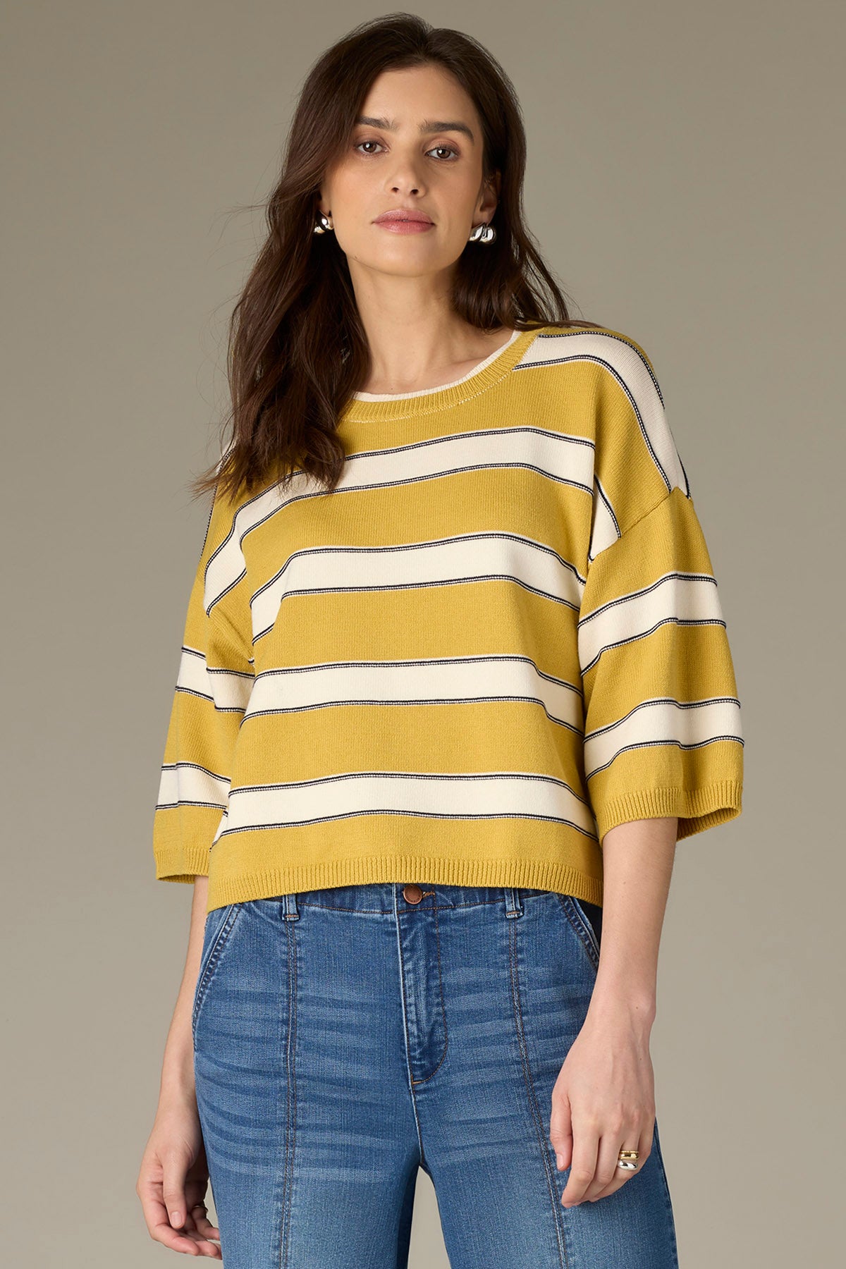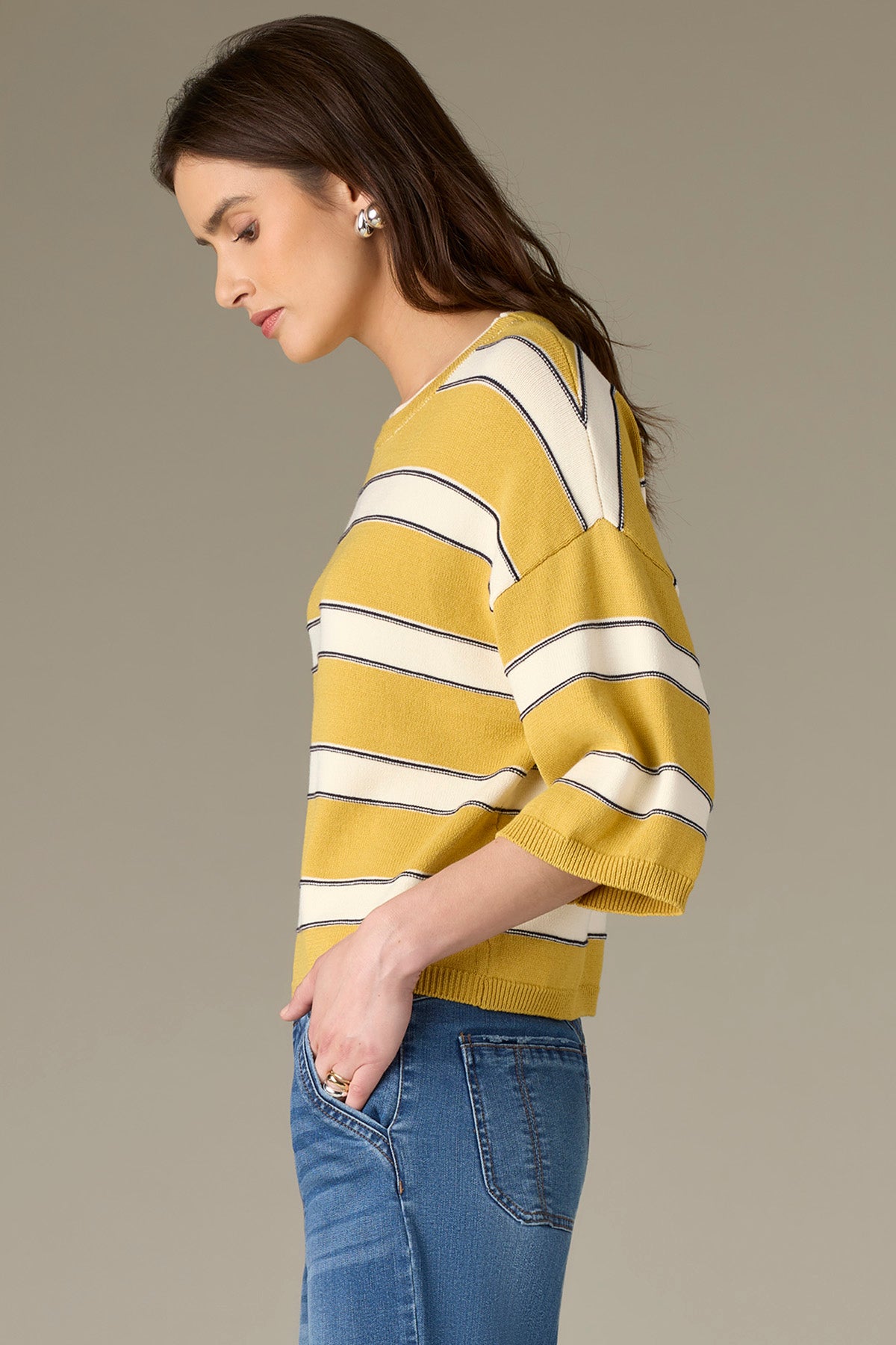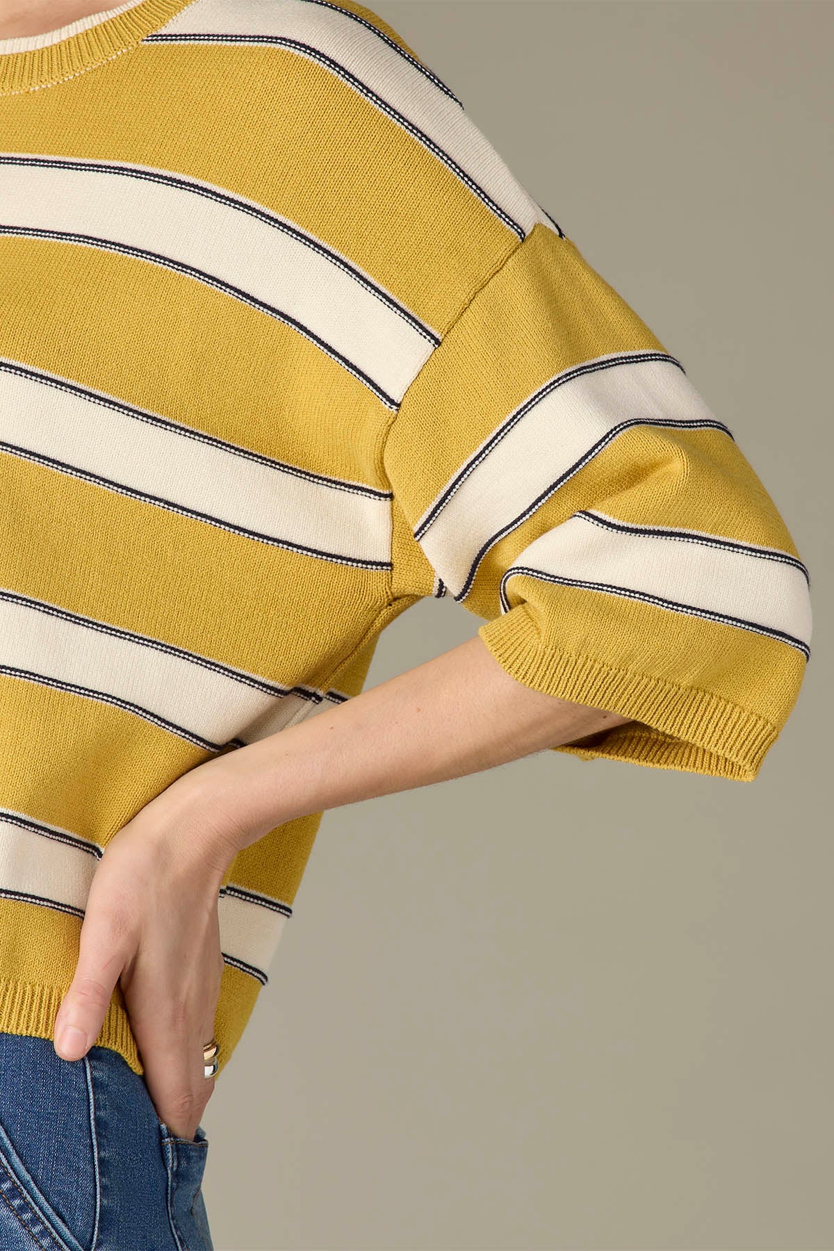 Below Elbow Sleeve Double Round Neck Rugby Stripe Sweater