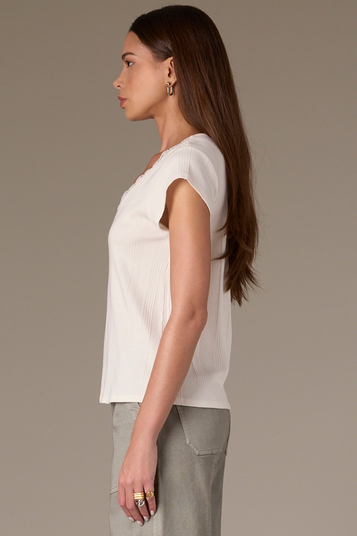 This petite knit top is a wardrobe staple, featuring cap sleeves, a rounded V-neck with lace trim, and a ribbed design. Pair it with blue jeans for a casual look or your go-to trousers for a polished ensemble.