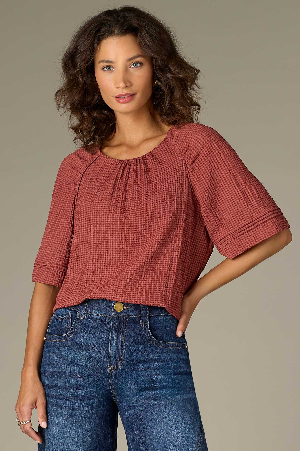 Add a pop of color and texture to your wardrobe with this petite woven top, designed with elbow raglan sleeves, a shirred scoop neck, and pintucking details. Pair it with everything from your favorite jeans to a polished pair of trousers.