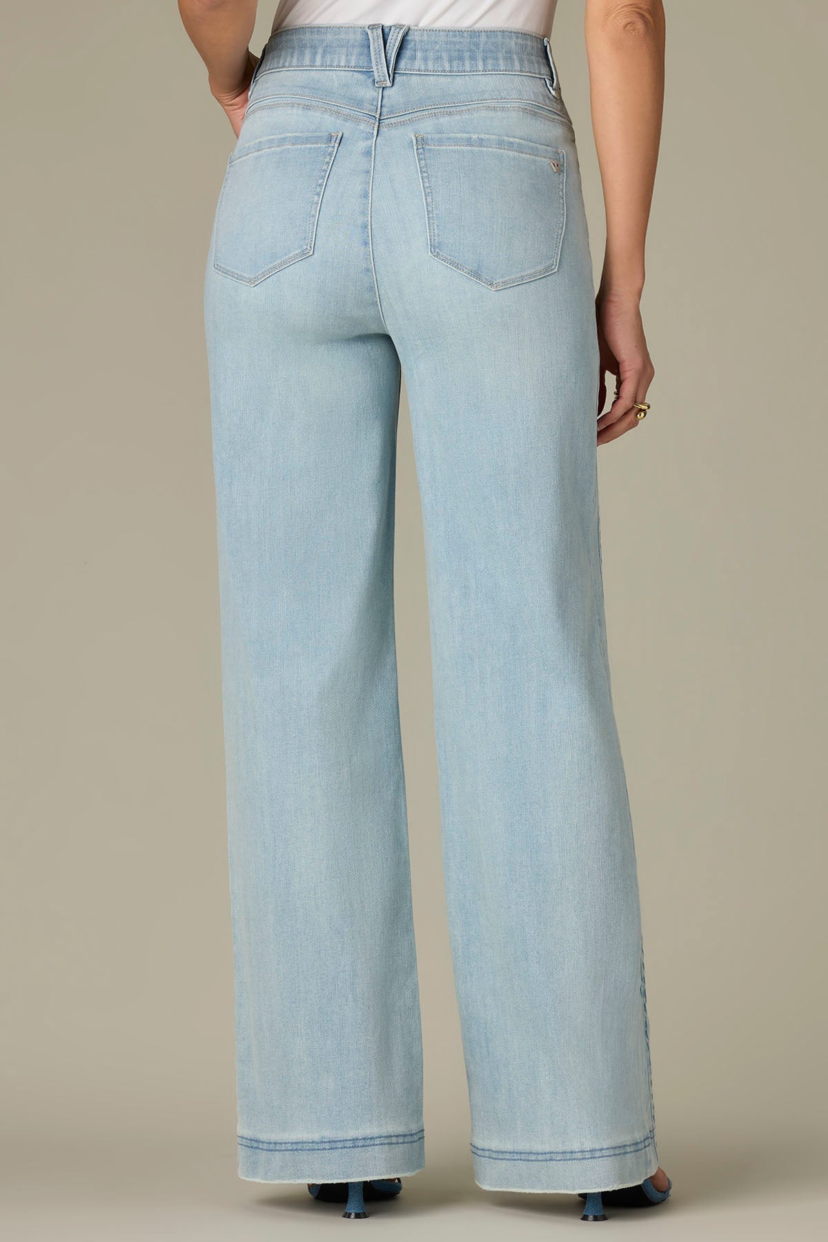 The light blue vintage Gracie Wide Leg in petite sizing is fitted through the hips with a relaxed, wide opening through the legs and double side seams. Made with double side seams, stitch detail, and Contour Shape Technology for a tailor-made, flawless fit and thoughtful design details. Made with recycled REPREVE® materials for a greener solution.