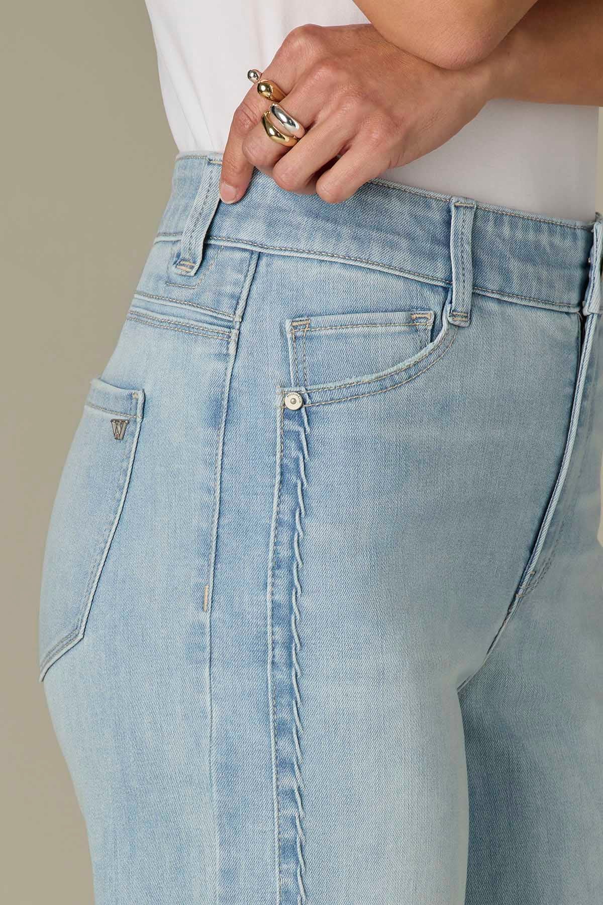 The Gracie Wide Leg jean in petite sizing is fitted through the hips with a relaxed, wide opening through the legs and double side seams.