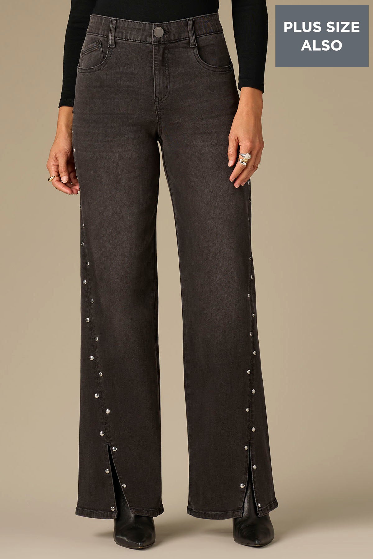 The plus-size Sam Wide Leg in a washed black hue is fitted through the hips with a relaxed, wide opening through the legs. Made with forward seam slits with studs and Contour Shape Technology for a tailor-made, flawless fit and thoughtful design details.