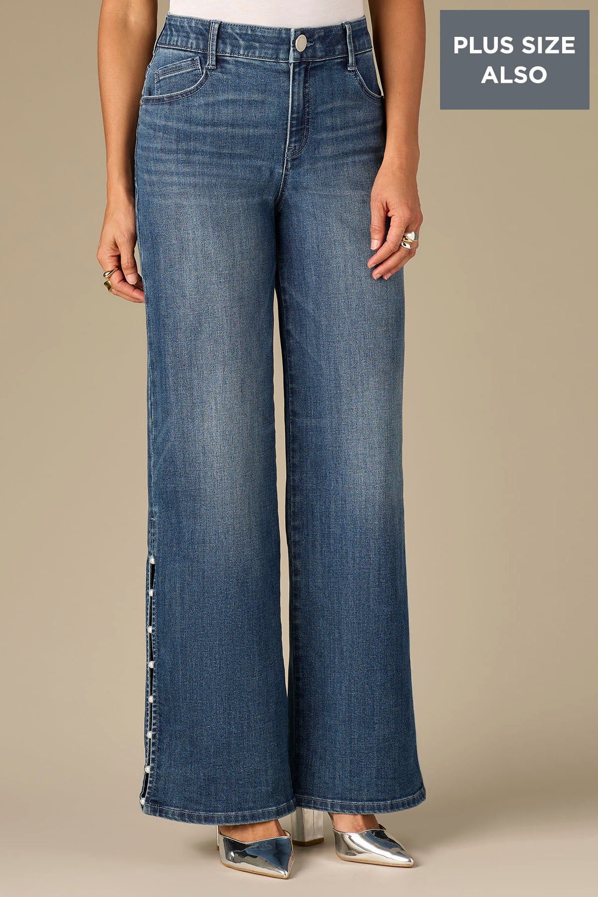 The Sam Wide Leg jeans in plus sizing are fitted through the hips with a relaxed, wide opening through the legs. Made with Contour Shape Technology for a tailor-made, flawless fit and thoughtful design details. Made with recycled REPREVE® materials for a greener solution.