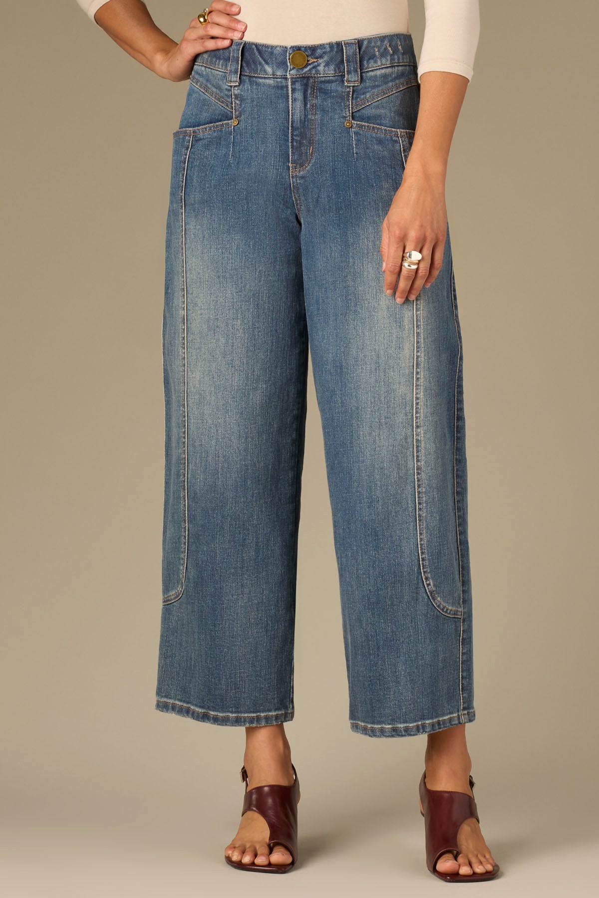 The petite Barely Barrel Leg jean is slightly fitted at the hips, with a relaxed, subtle curve from the thighs that tapers back at the ankle.
