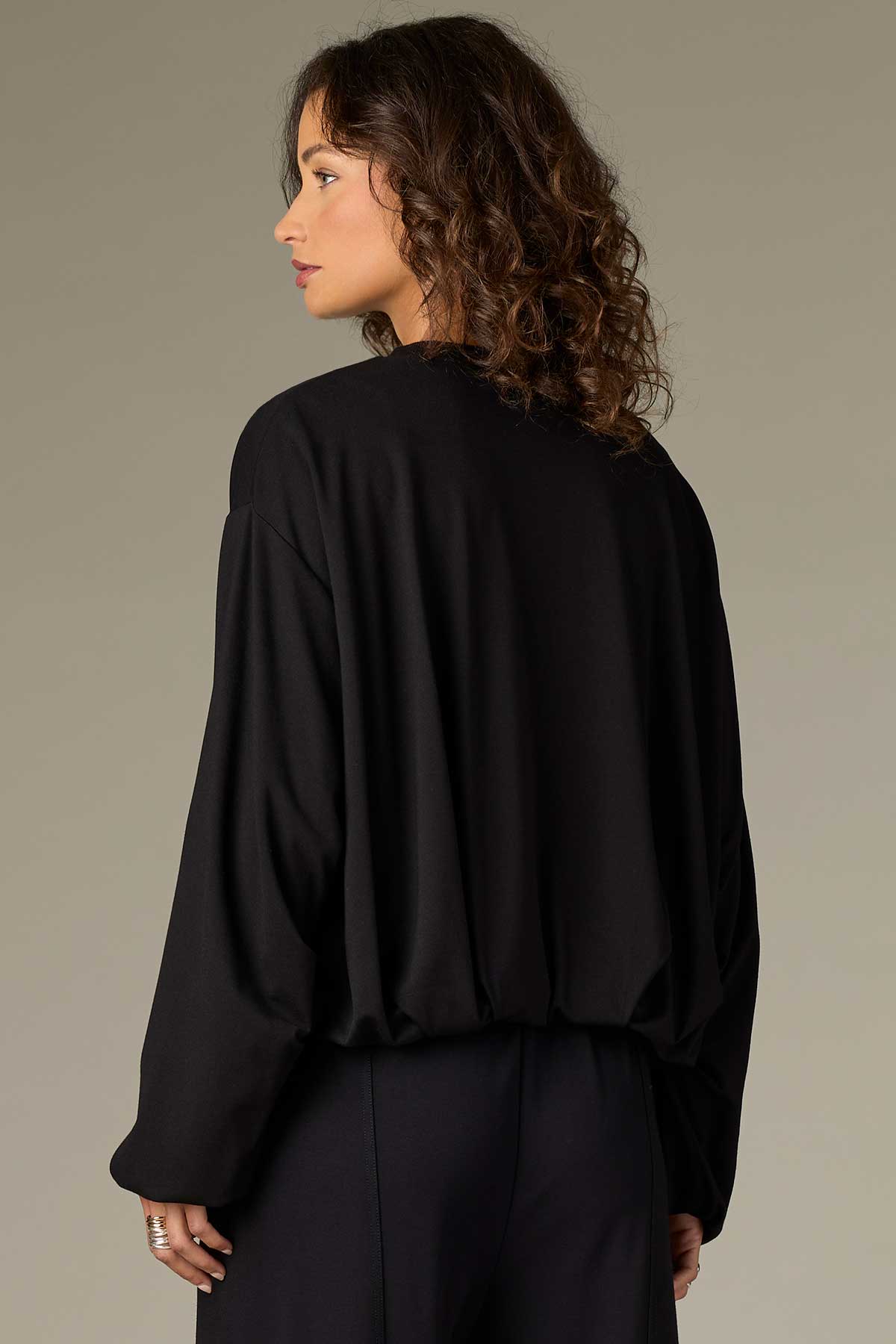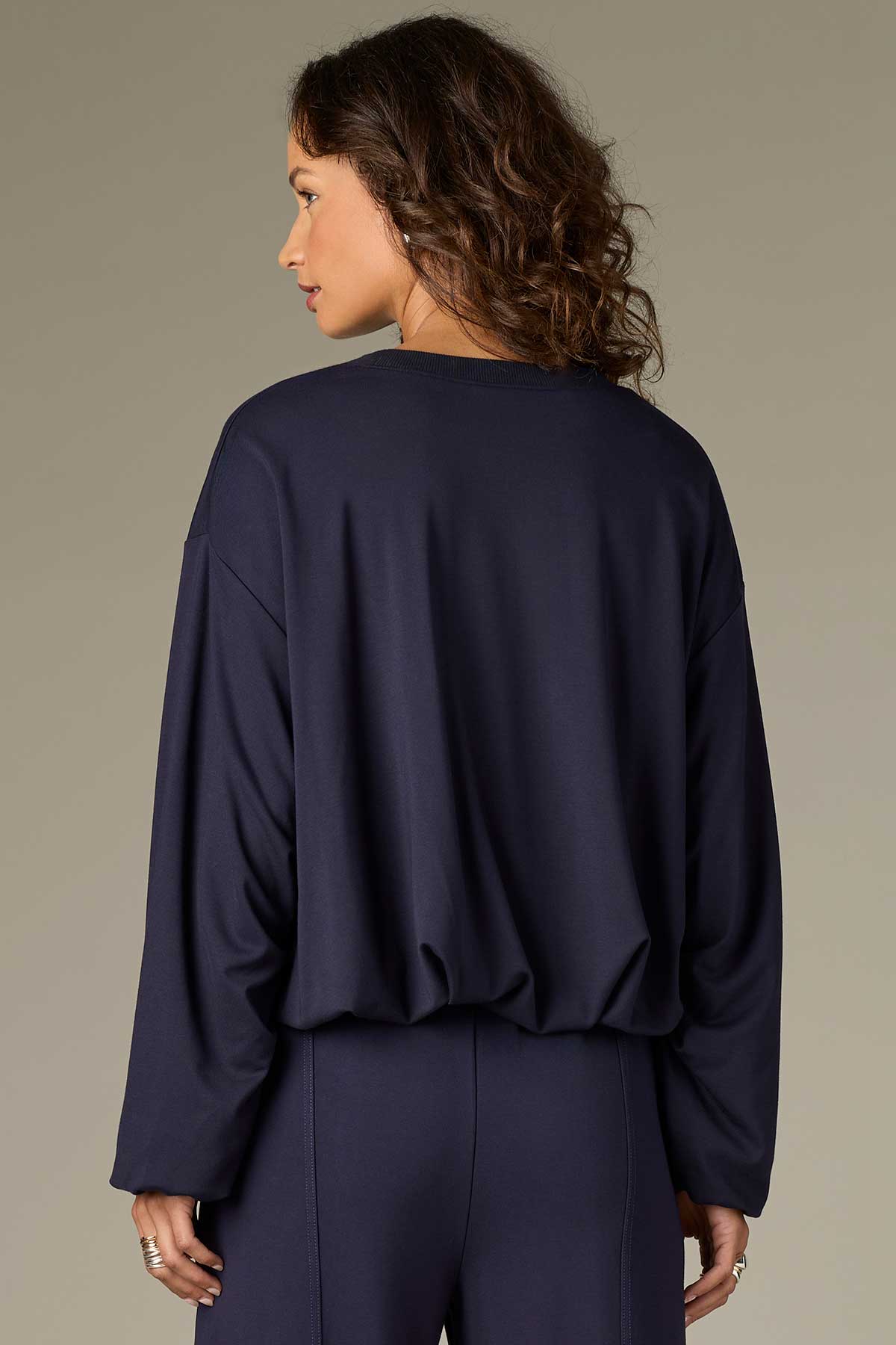 This knit pullover top in plus sizing has long barrel sleeves, a crew neck, and a pleated bubble hem. Pair it with our matching Wide Leg Glider pants for an effortlessly coordinated look.