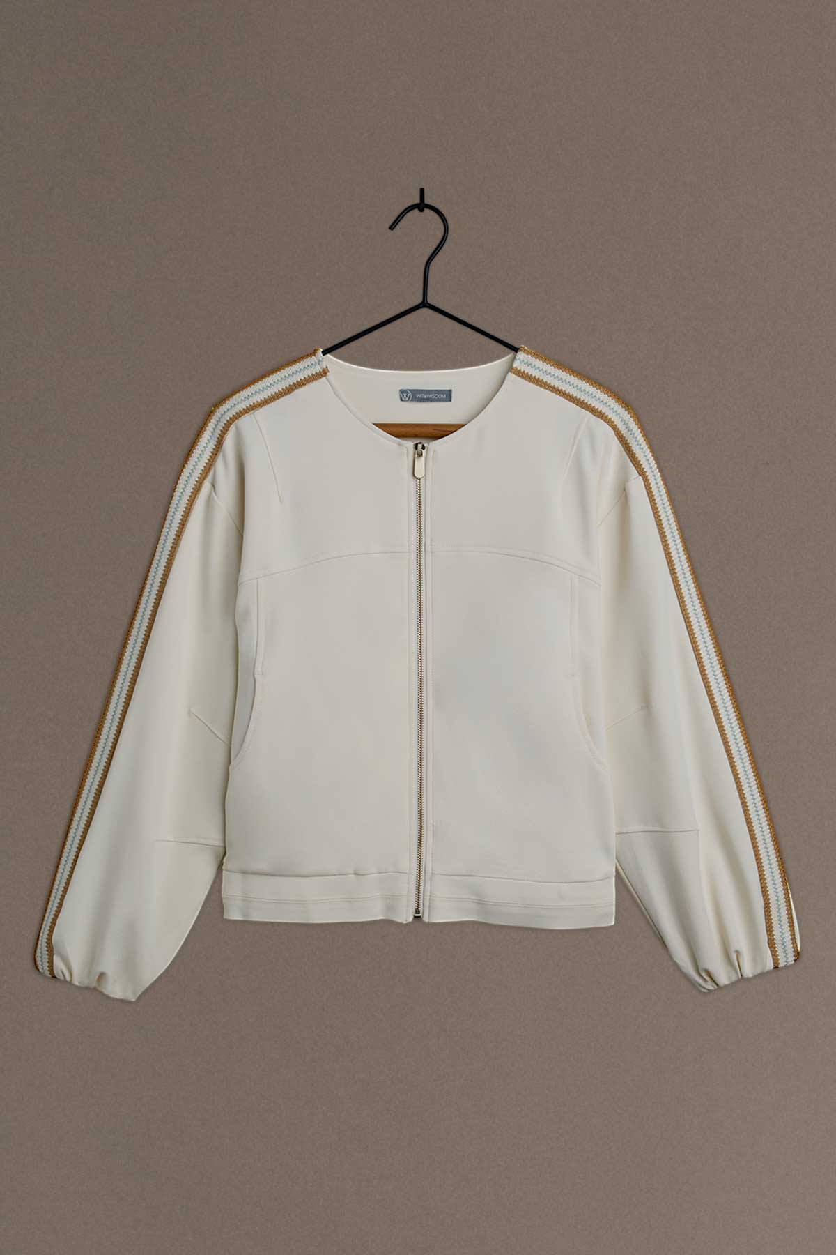 With long blouson sleeves, a round neck, zip front, and a stripe trim, this jacket is modern and on-trend. Wear it with our matching Palazzo Glider pants to look effortlessly put-together.