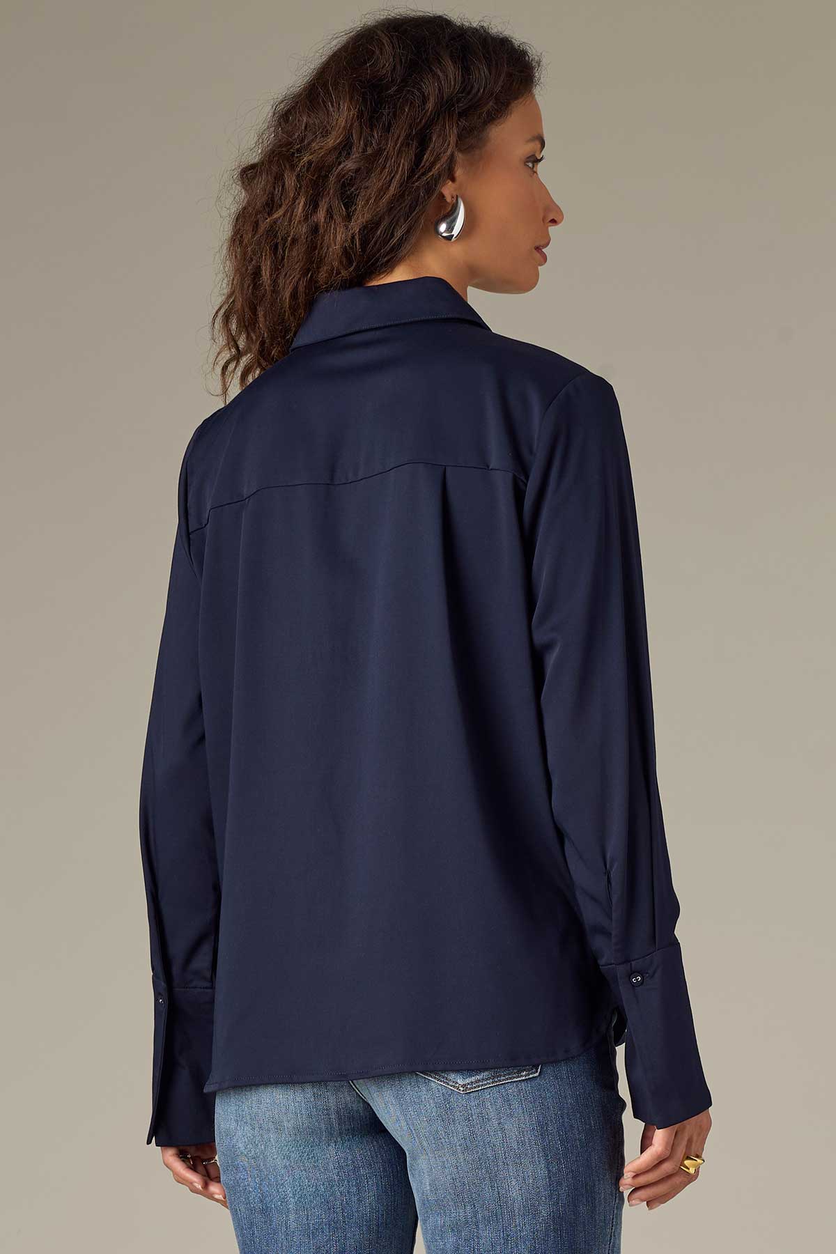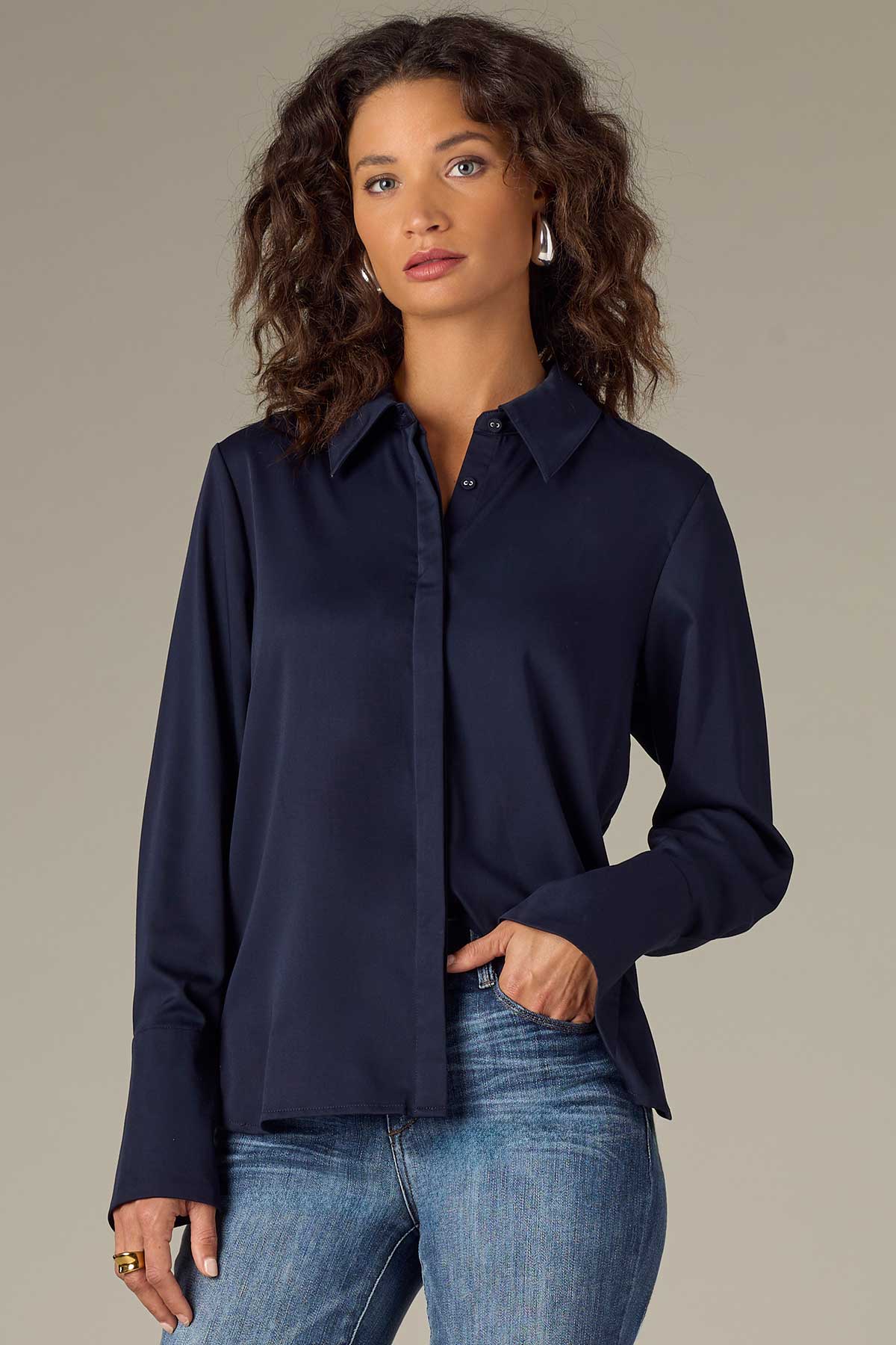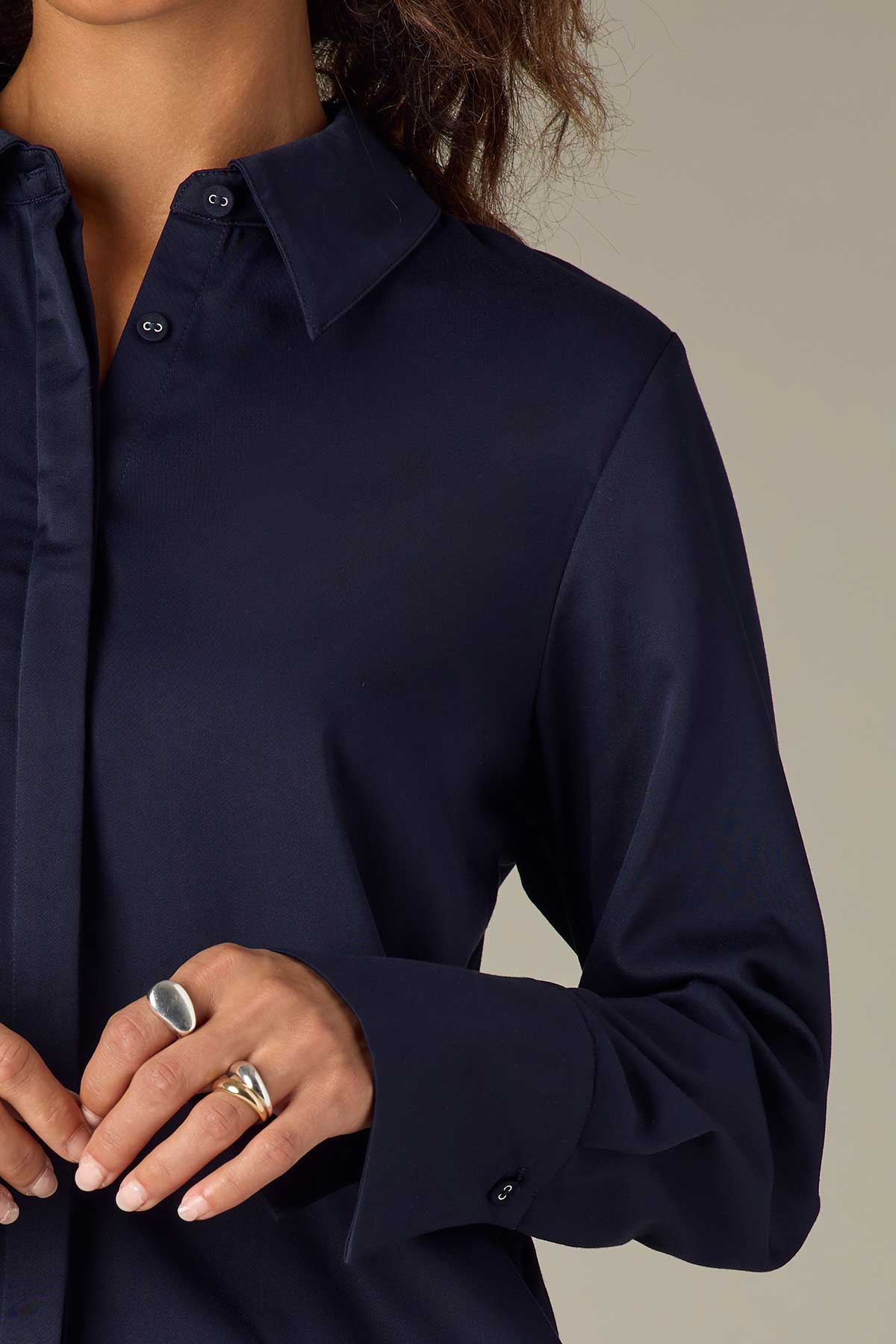 Long French cuff sleeves, a long collared neck, a hidden button down placket, and a square yoke add a sophisticated finish to this woven shirt.