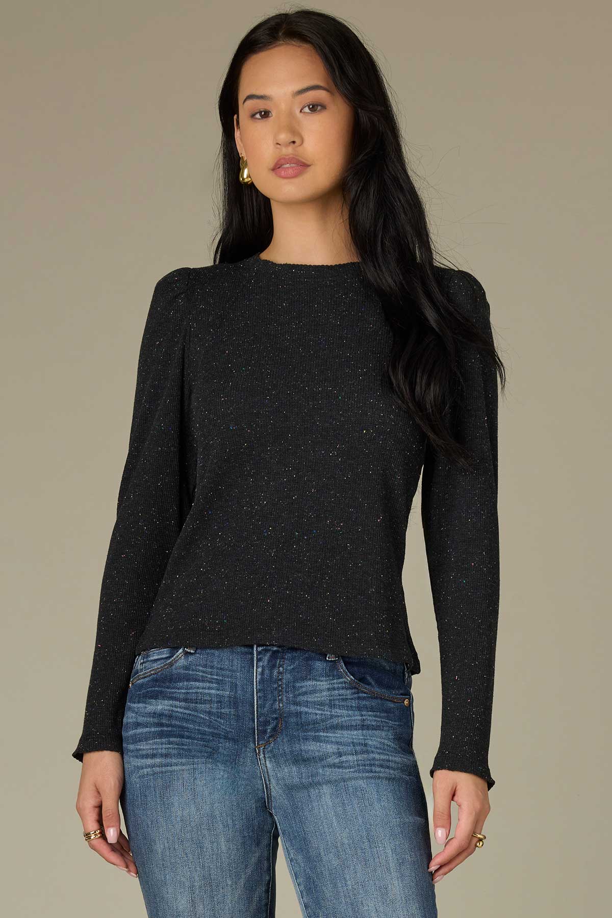 Long Puff Sleeve Crew Neck Speckled Thermal Knit Top