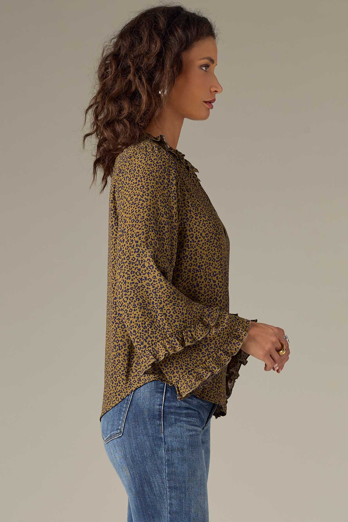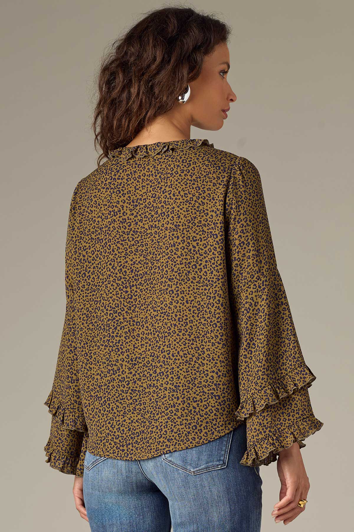 Featuring long romantic sleeves, a ruffle split V-neck with a keyhole, and a front center seam placket, this petite woven top is a showstopper. Its olive tapenade and navy hues make it an autumnal staple that complements all your neutrals.