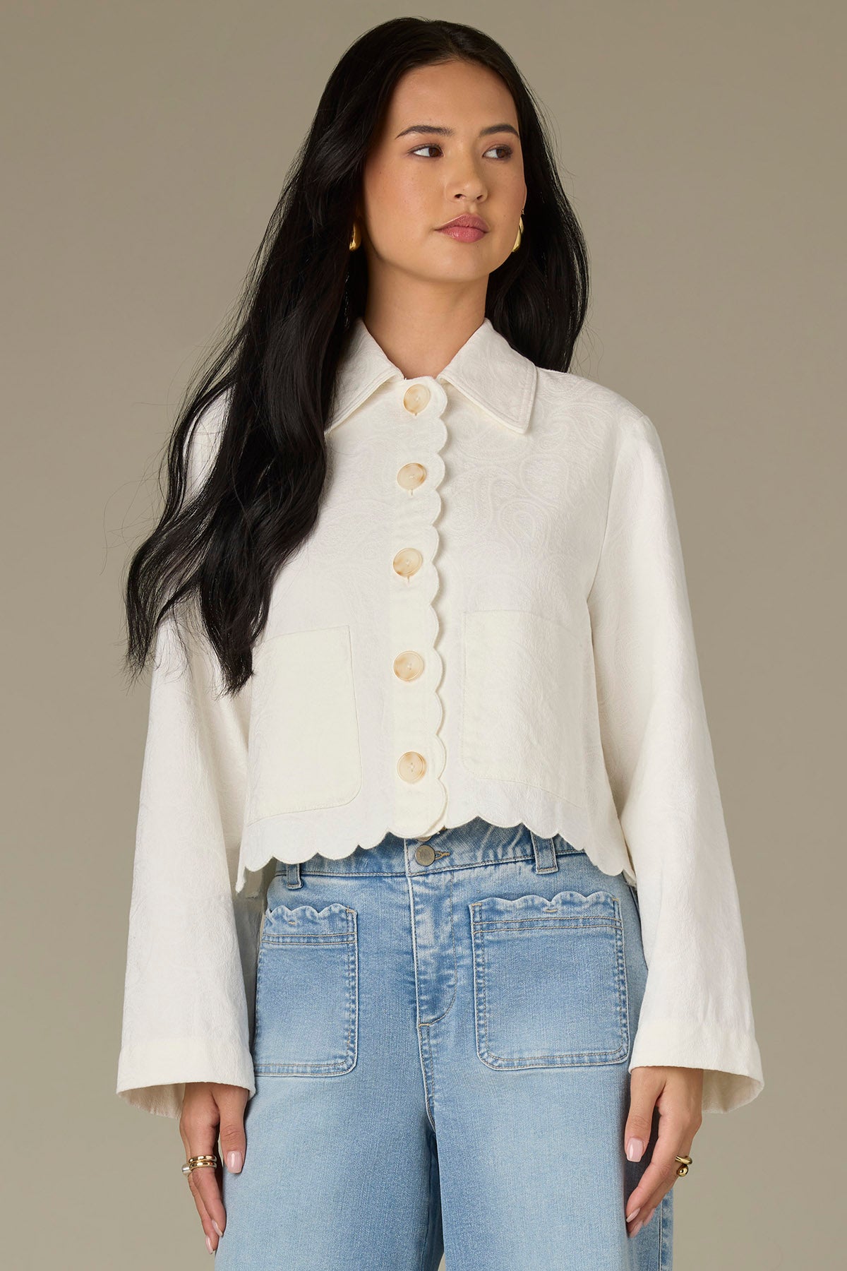 Long Sleeve Button Front Patch Pocket Cropped Scallop Hem Jacket