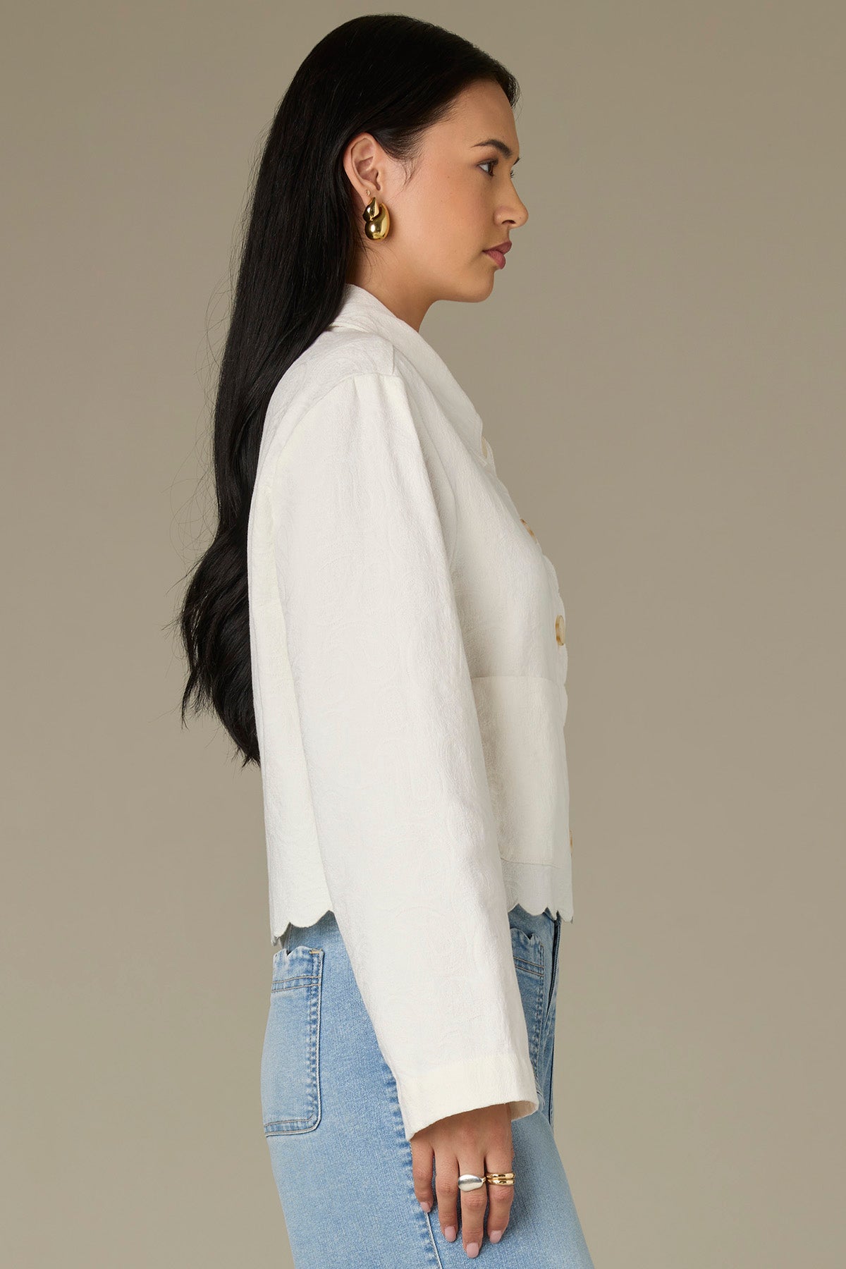 Slip into this cropped white denim jacket for in instant dose of self-assurance. It has a button down front, scallop placket, patch pockets, paisley embroidery, and a scallop hem.