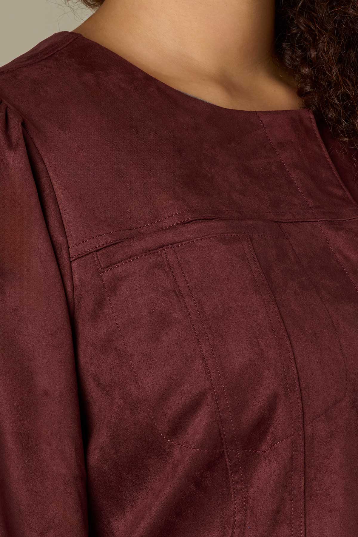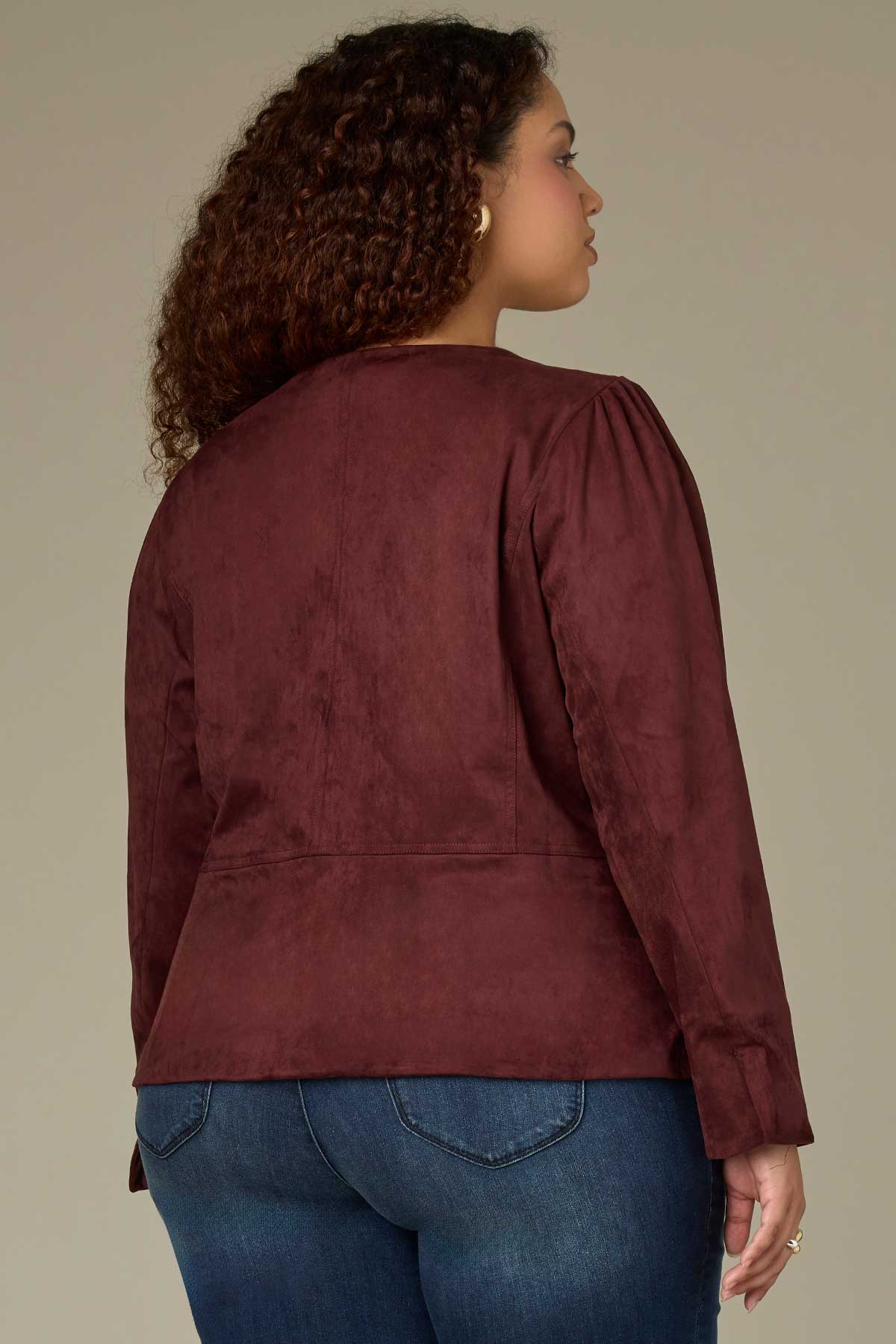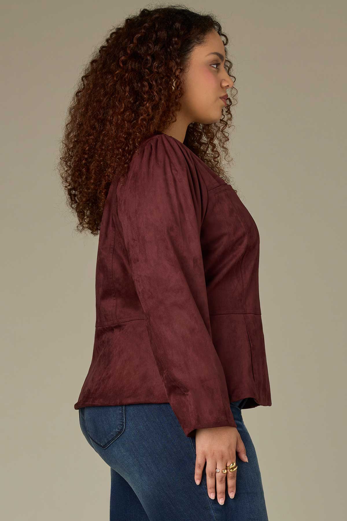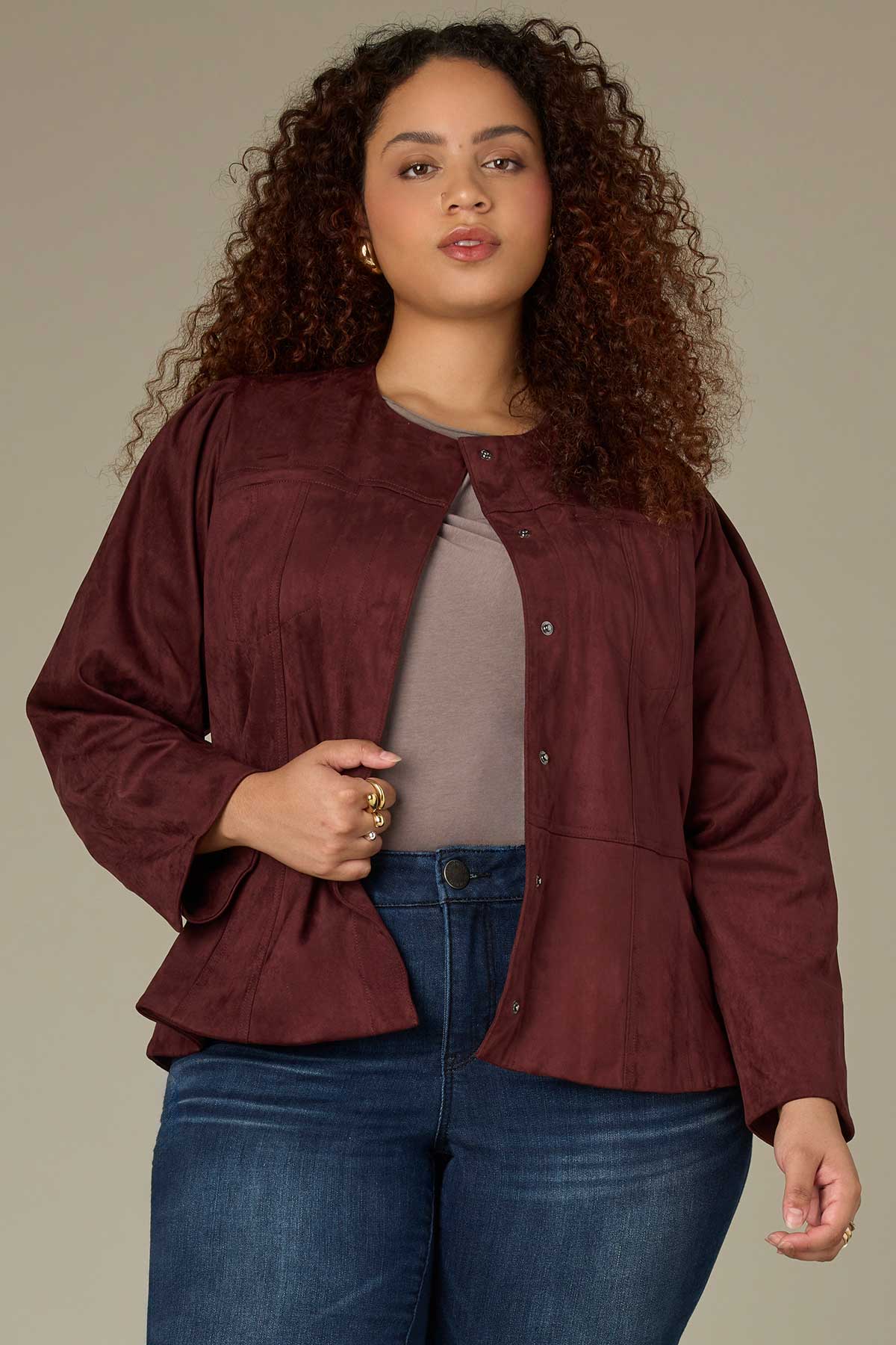 Featuring long puff sleeves, a collarless round neck, and a peplum hem, this faux suede jacket in plus sizing is your year-round go-to layer. It also has a hidden snap front and side entry pockets.