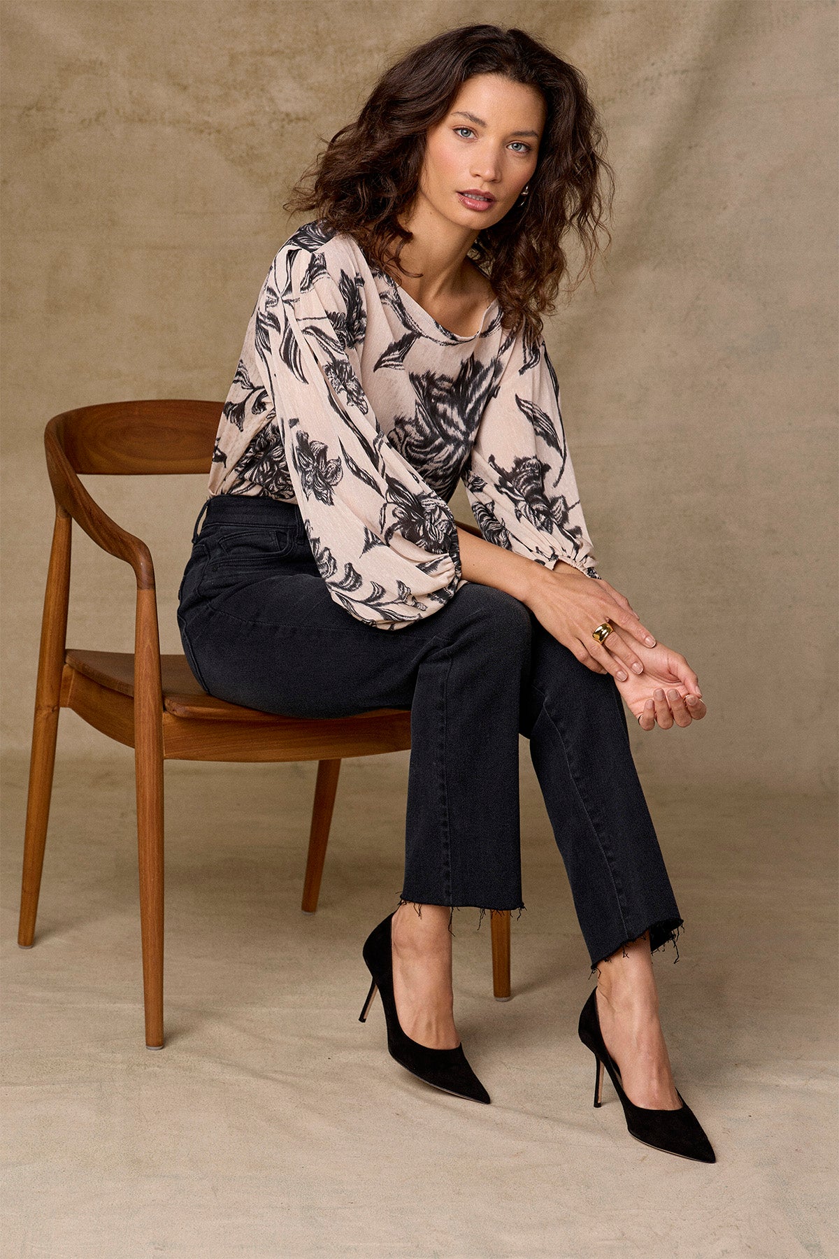 Peasant Sleeve Boat Neck Floral Print Petite Woven Top