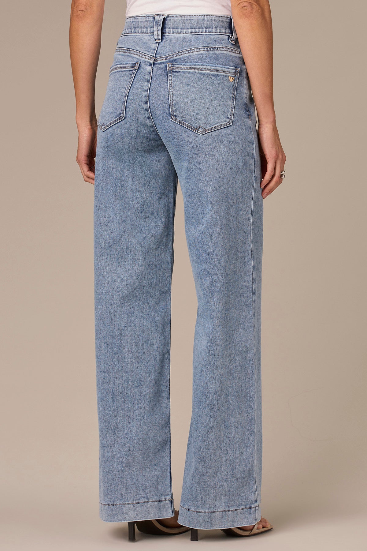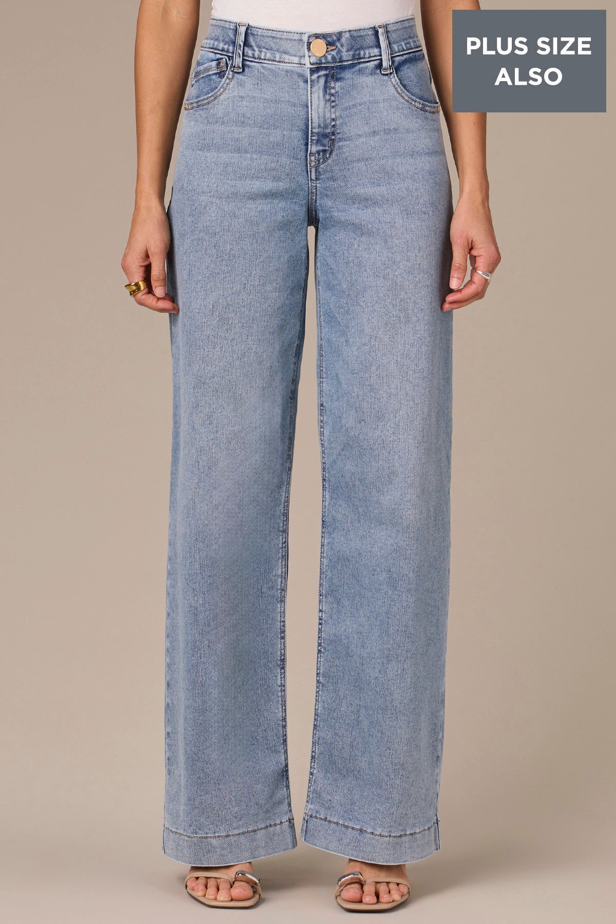 The plus-size Sam Wide Leg is fitted through the hips with a relaxed, wide opening through the legs.