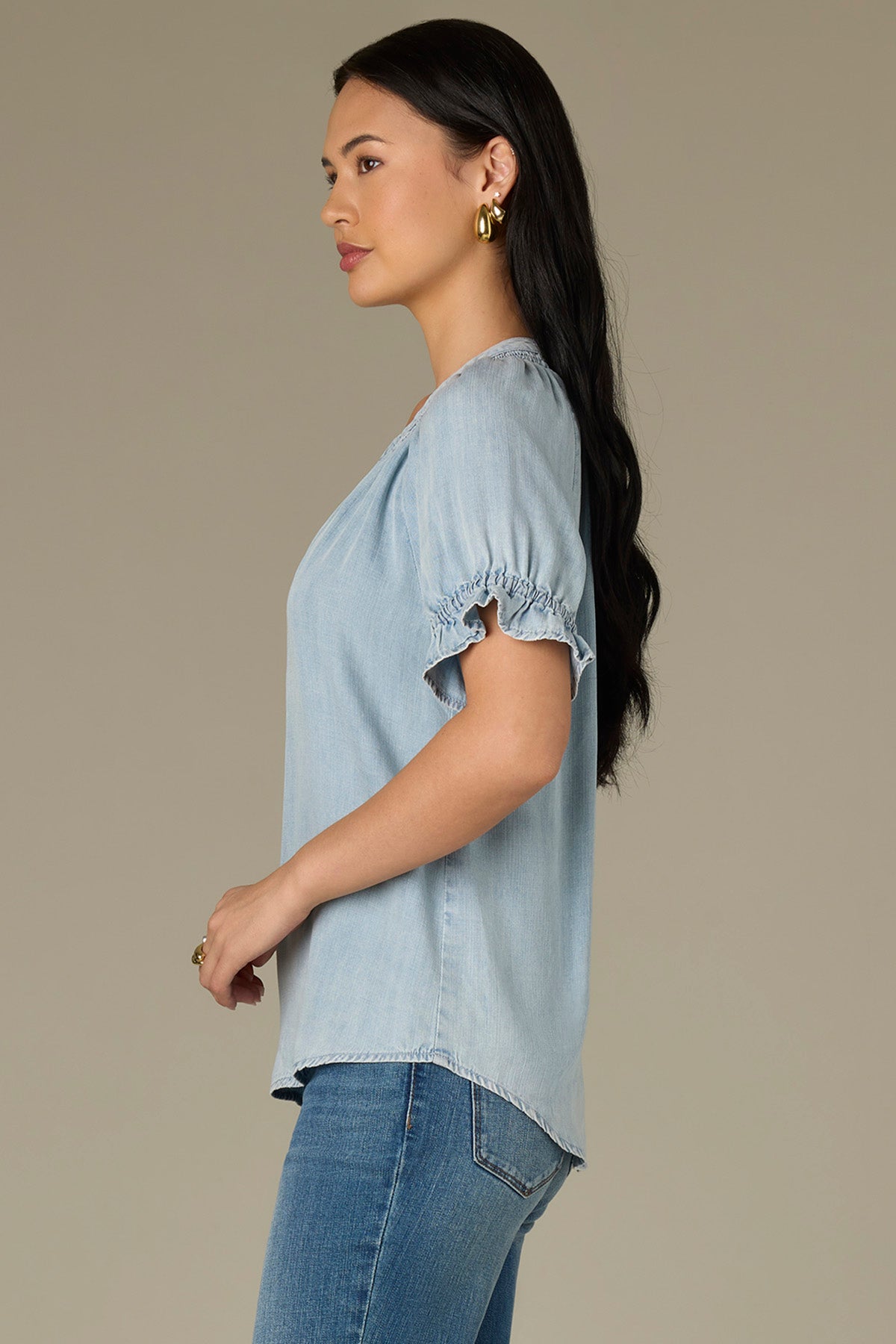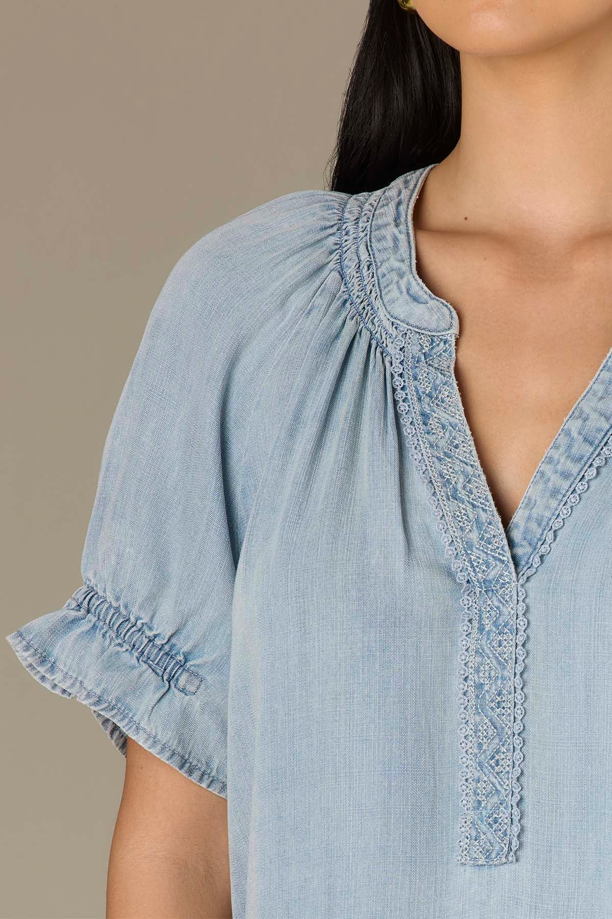 This woven top features short cinched sleeves, a smocked stand collar, V-neck, and an embroidered placket. Made for pairing with everything from denim to trousers.