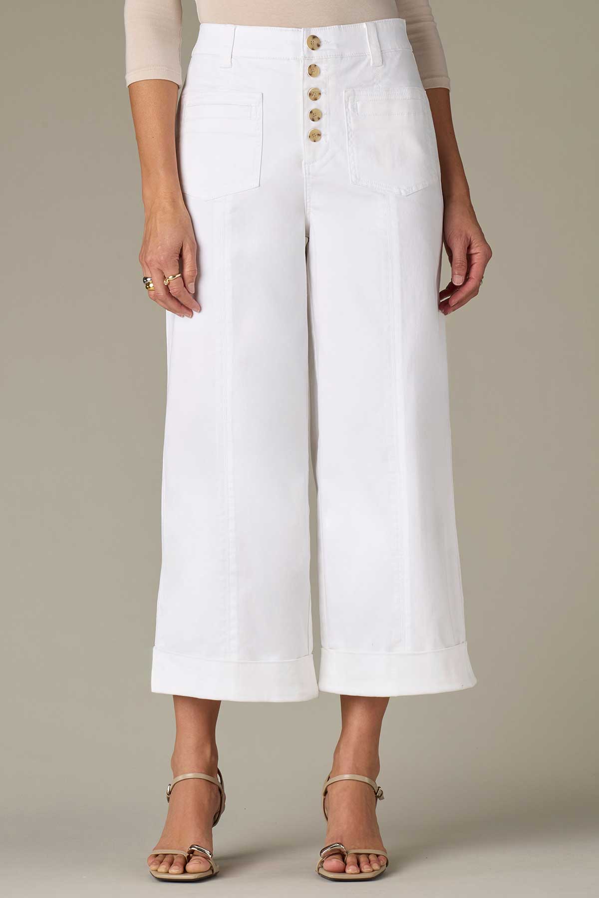Skyrise Button Fly Petite Wide Leg Pants with Fixed Cuff Hem