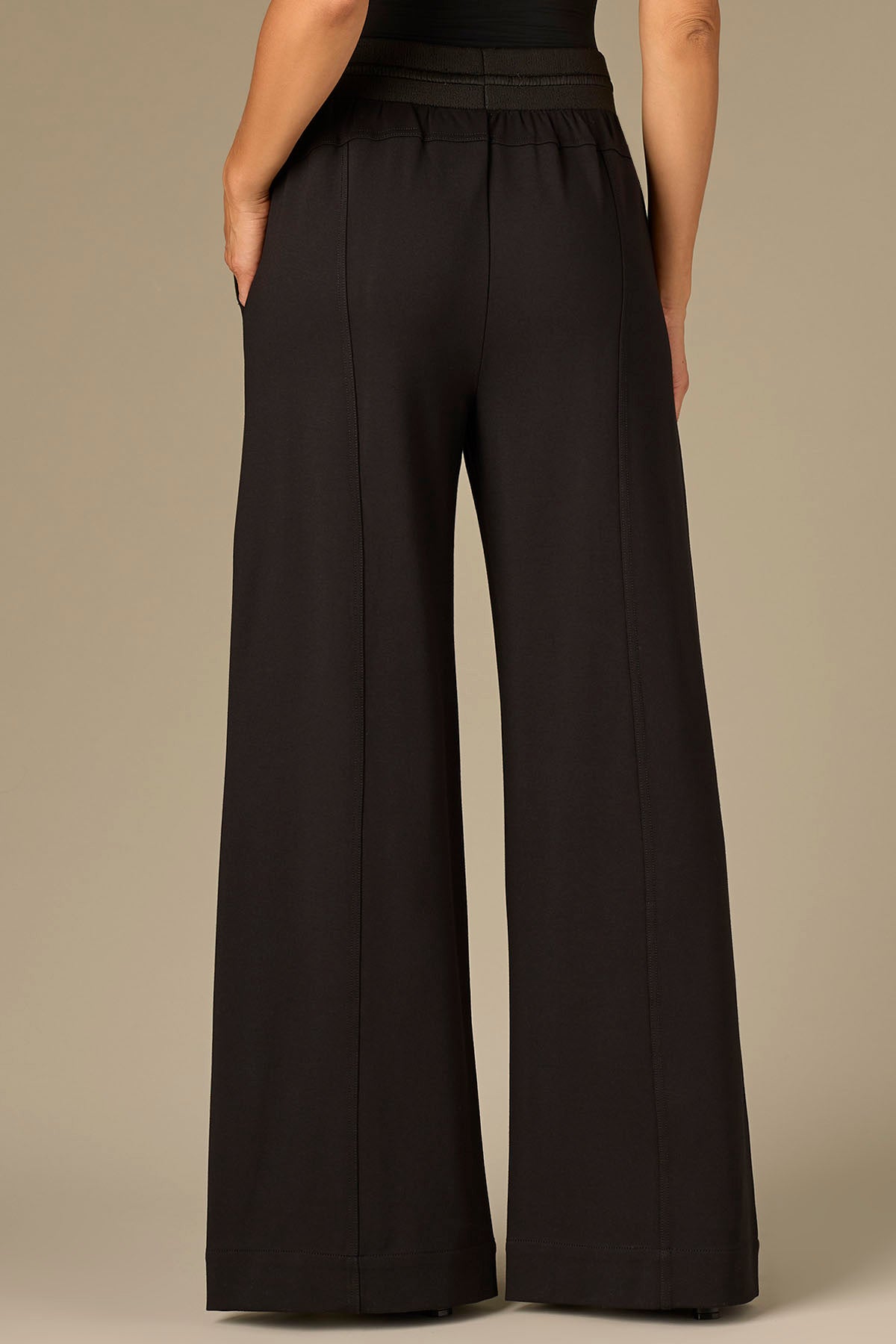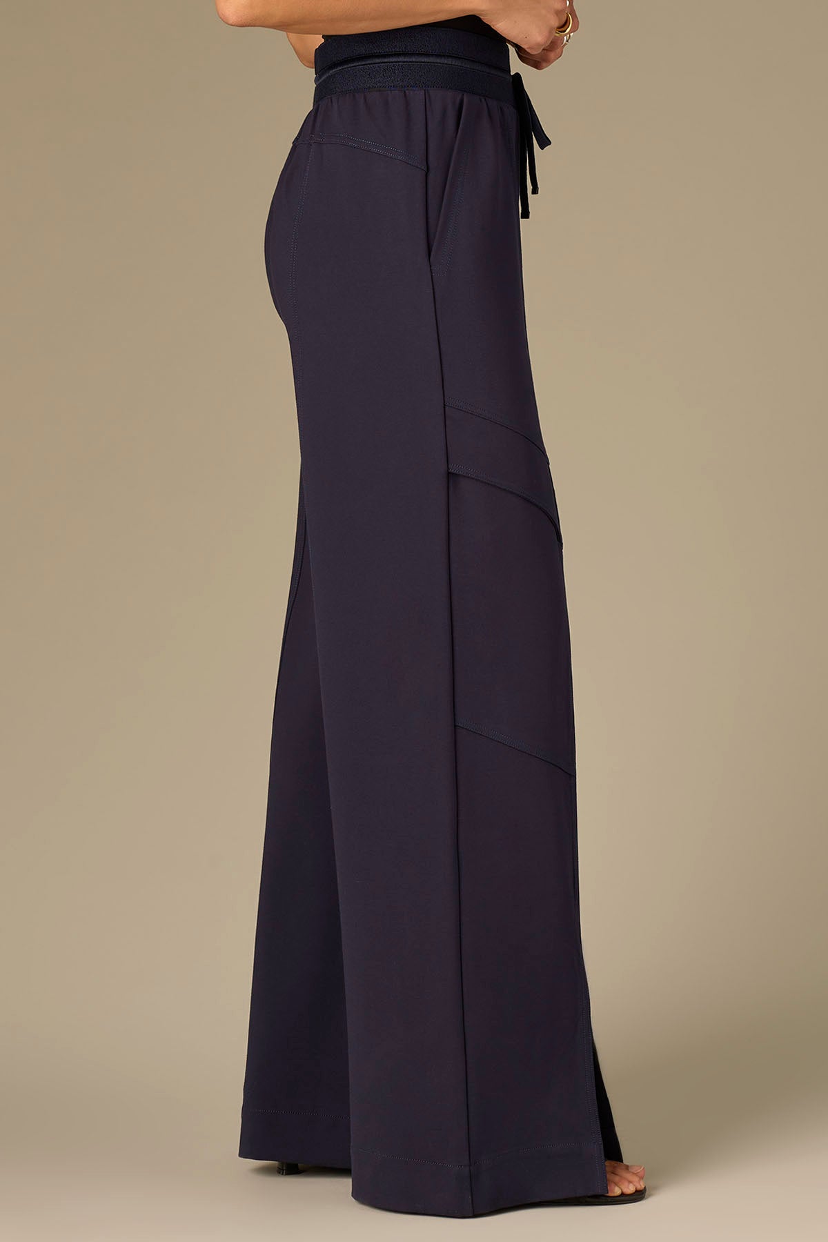 Our Wide Leg Glider in plus sizing is fitted through the hips with a relaxed, wide opening through the legs and an elastic pull-on waist. Made with luxe leisure design details that strike a balance between comfortable and polished, as well as curved flap pockets and a front slit hem.