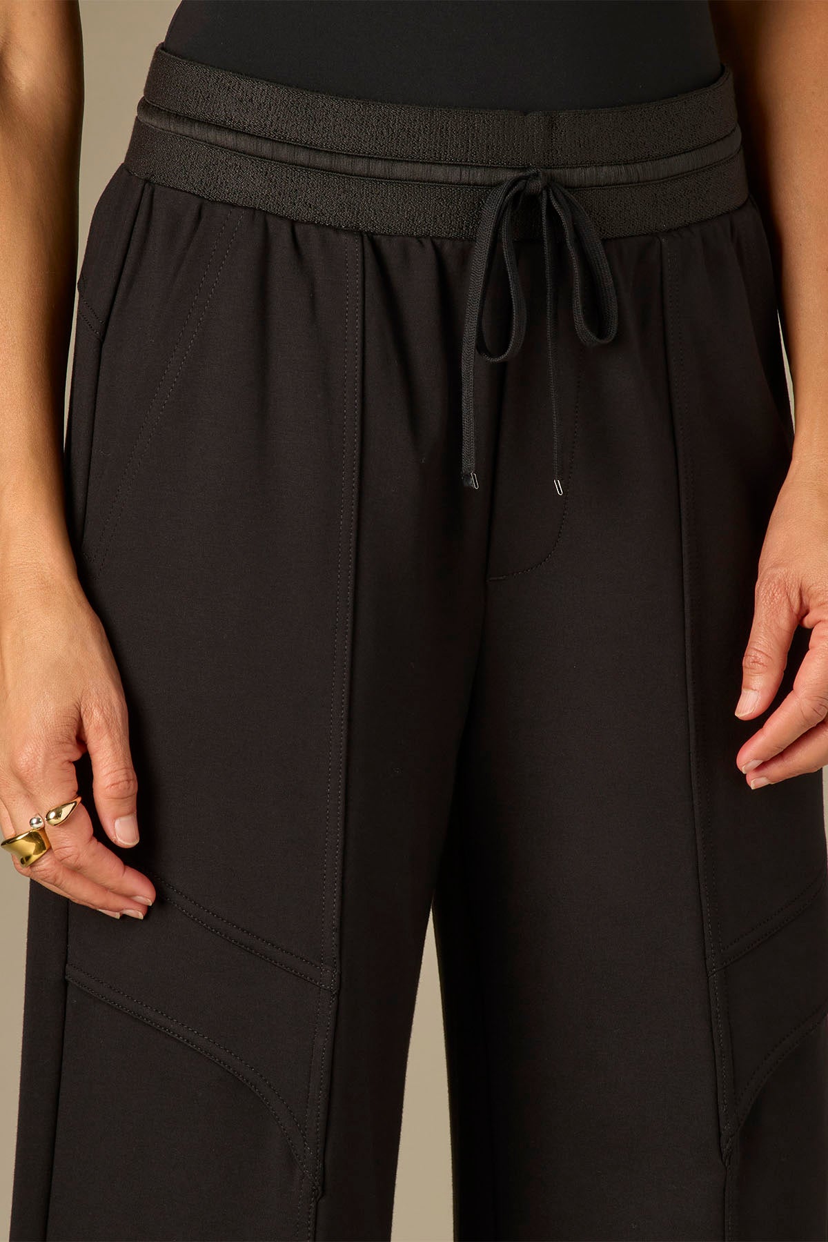 This Wide Leg Glider is fitted through the hips with a relaxed, wide opening through the legs. and an elastic pull-on waist.