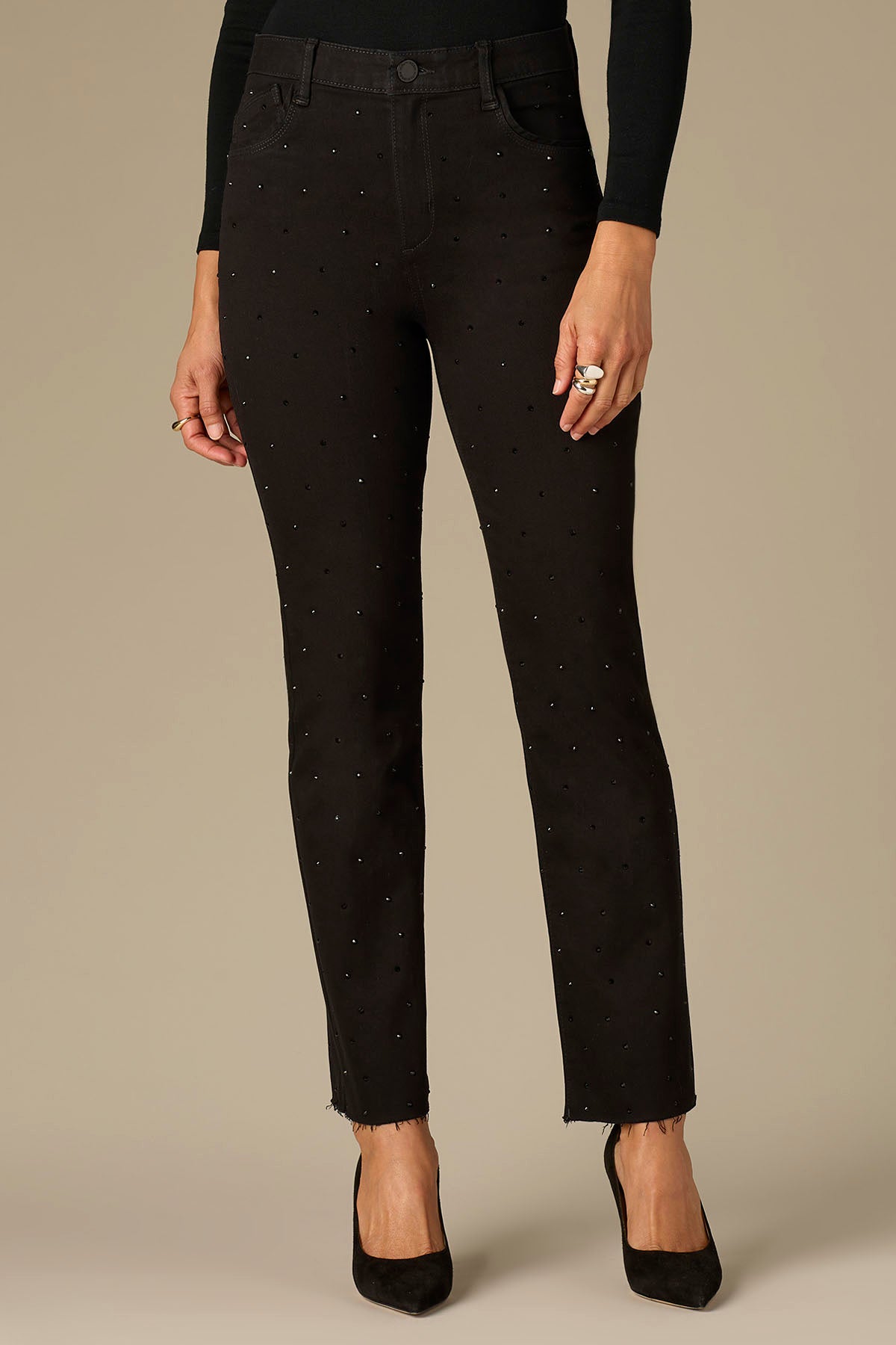 These black Bennett Barely Bootcut jeans are a relaxed and easy straight fit throughout the leg with a subtle flare at the hem, made for all-day comfortable wear. Designed with a V-yoke, rhinestone detailing, a raw hem, and Contour Shape Technology for a tailor-made, flawless fit and thoughtful design details.