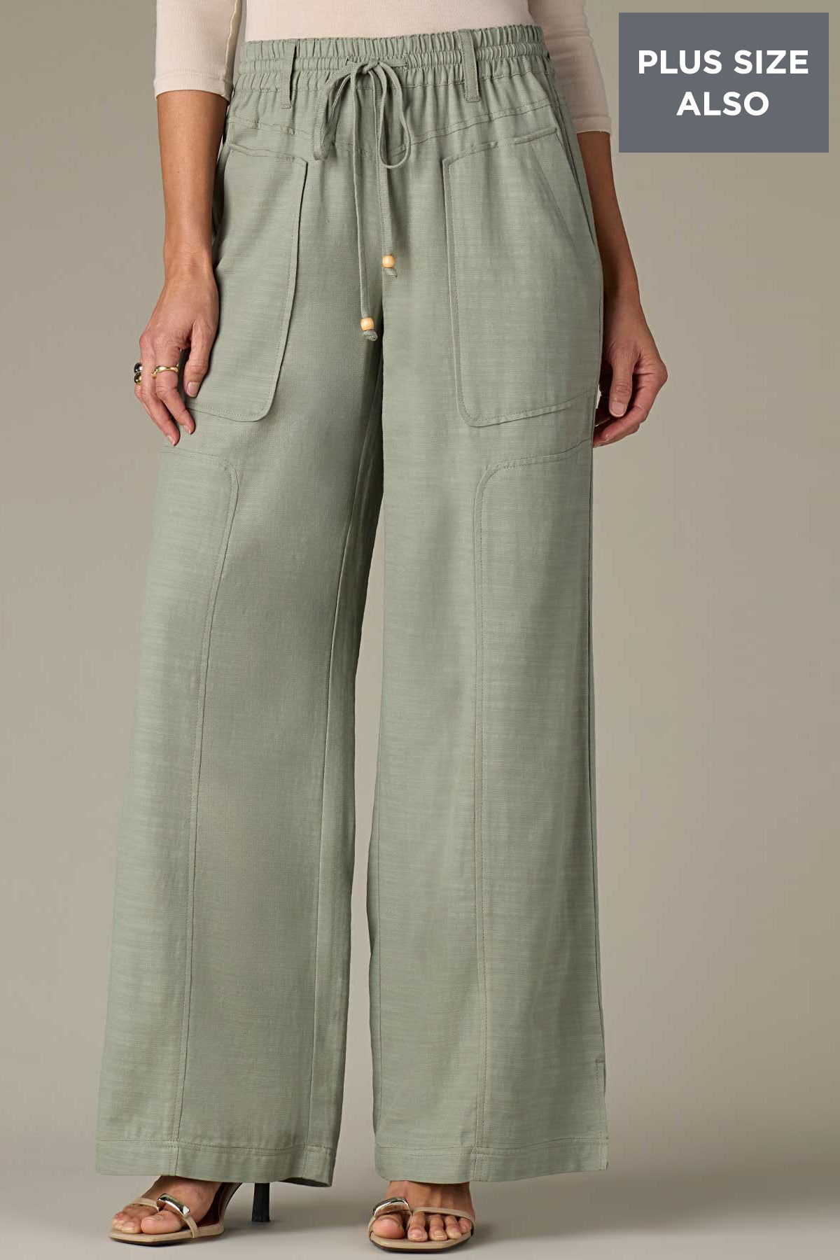 These Wide Leg pants in plus sizing are fitted through the hips with a relaxed, wide opening through the legs.