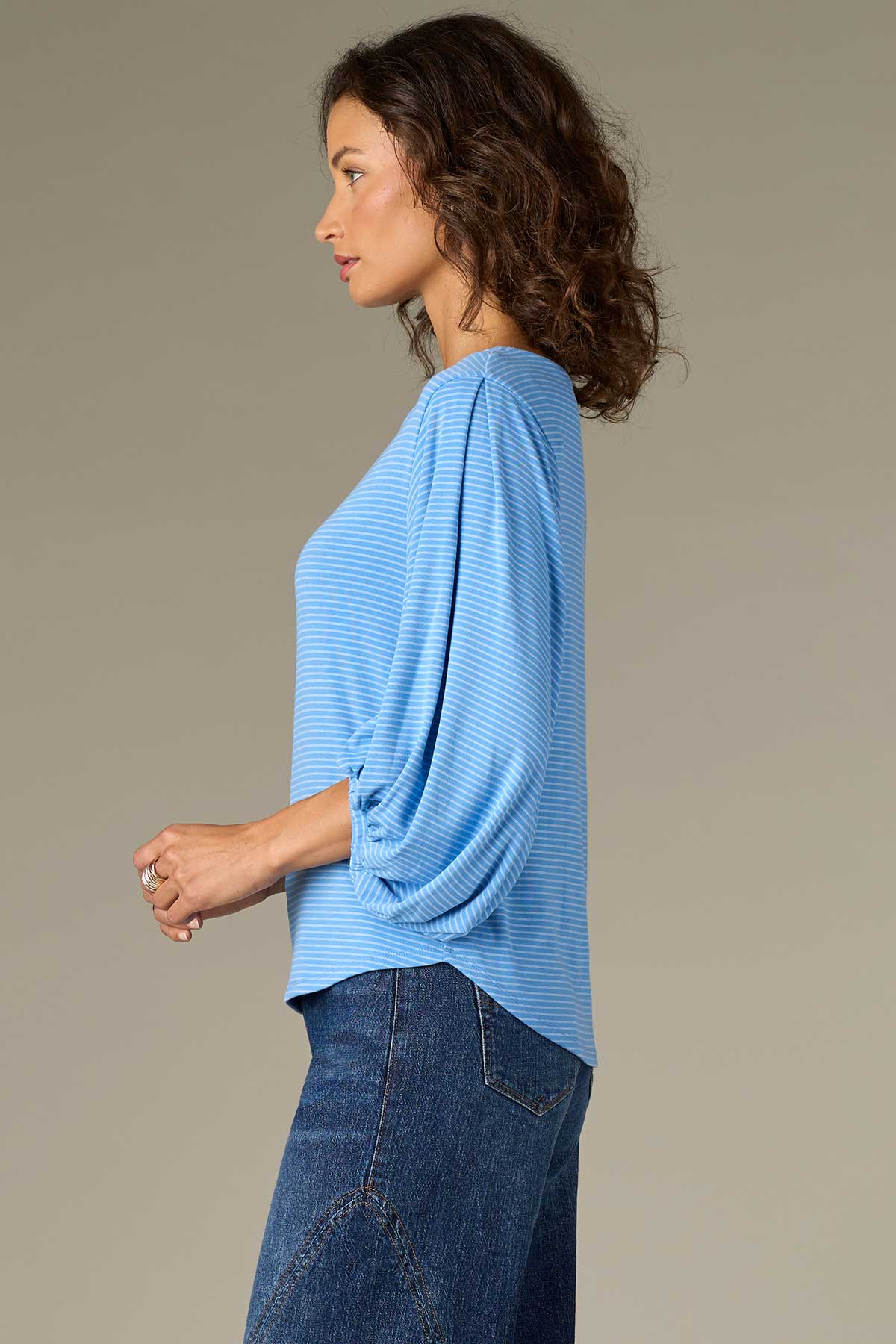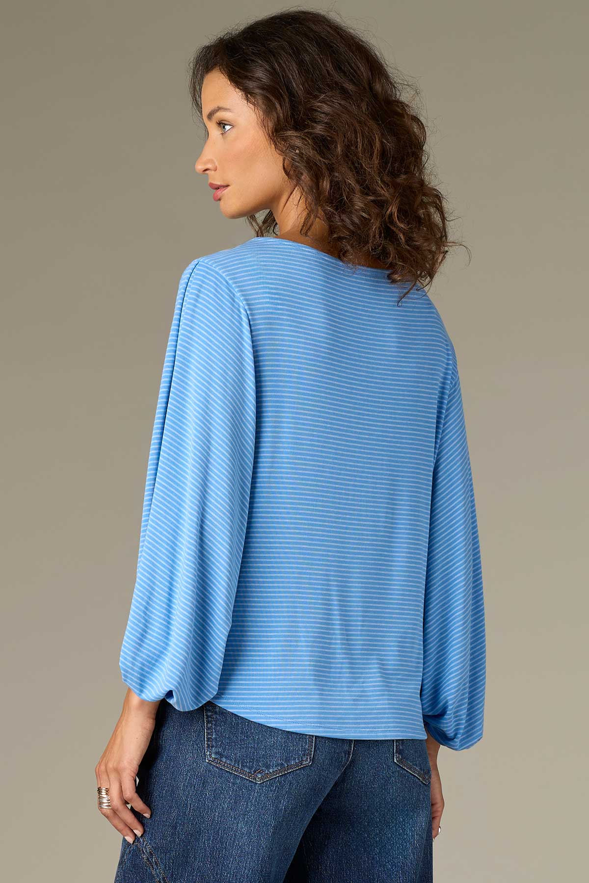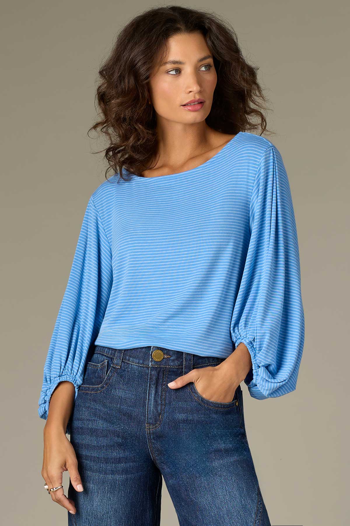 For everyday ease, slip into this flowy knit top. It features three quarter blouson sleeves, a boat neck, and a stripe print --- so versatile, you’ll want one in every color.