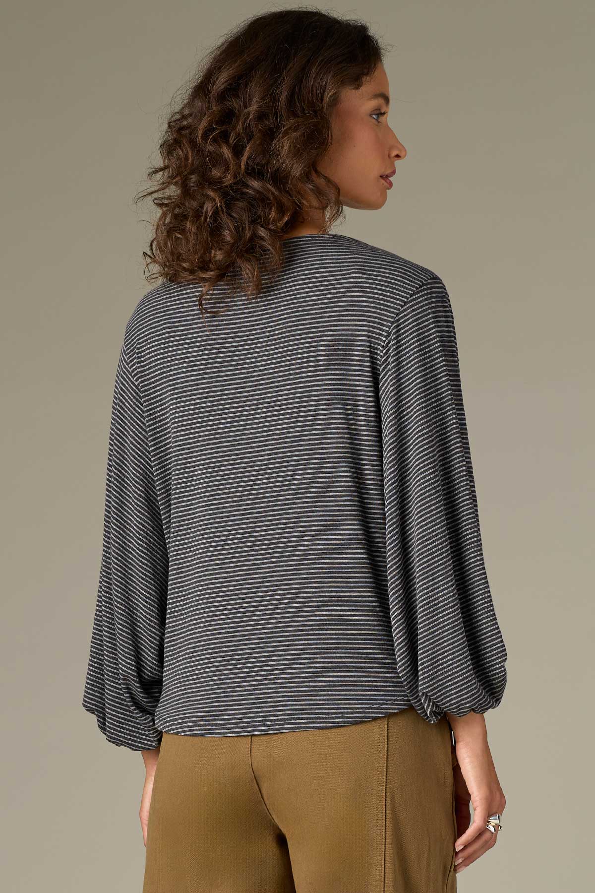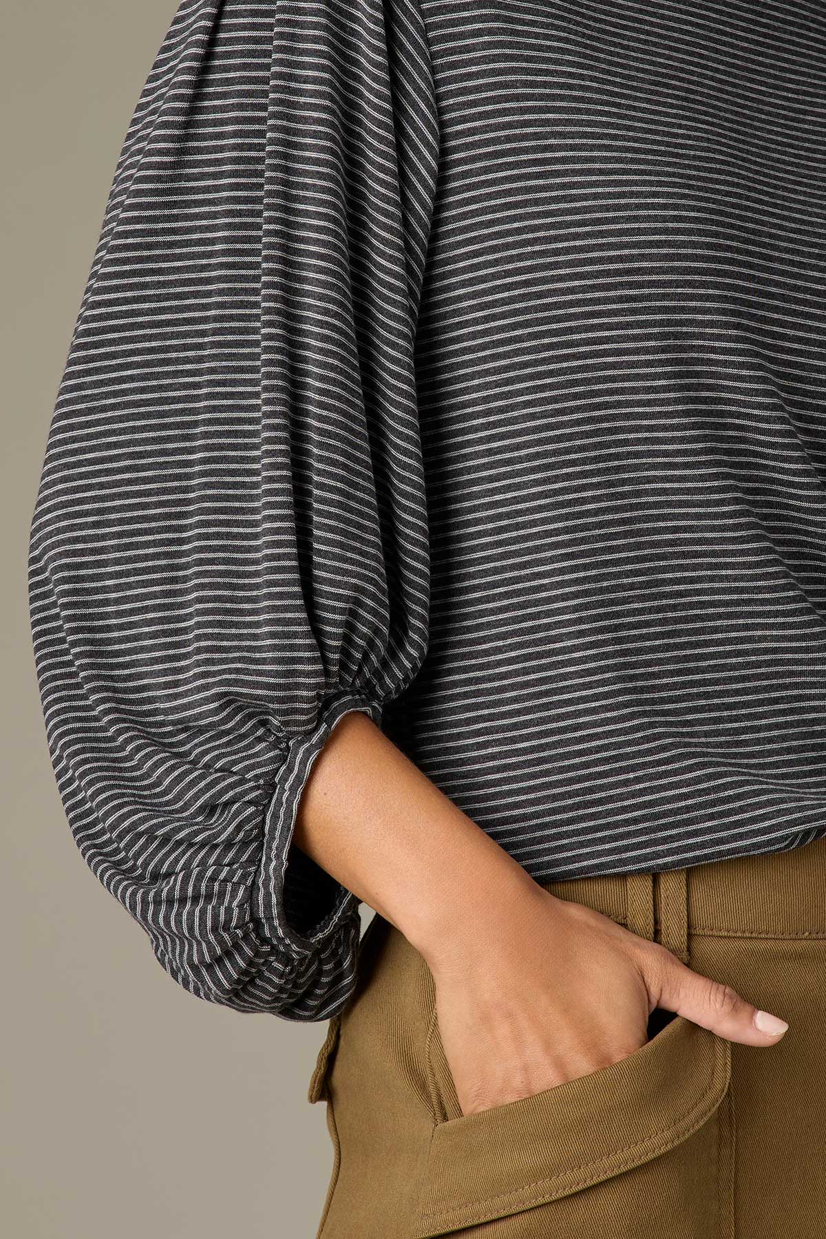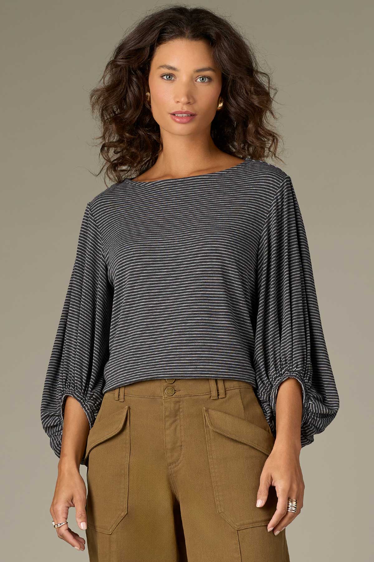 Three Quarter Blouson Sleeve Boat Neck Striped Petite Knit Top