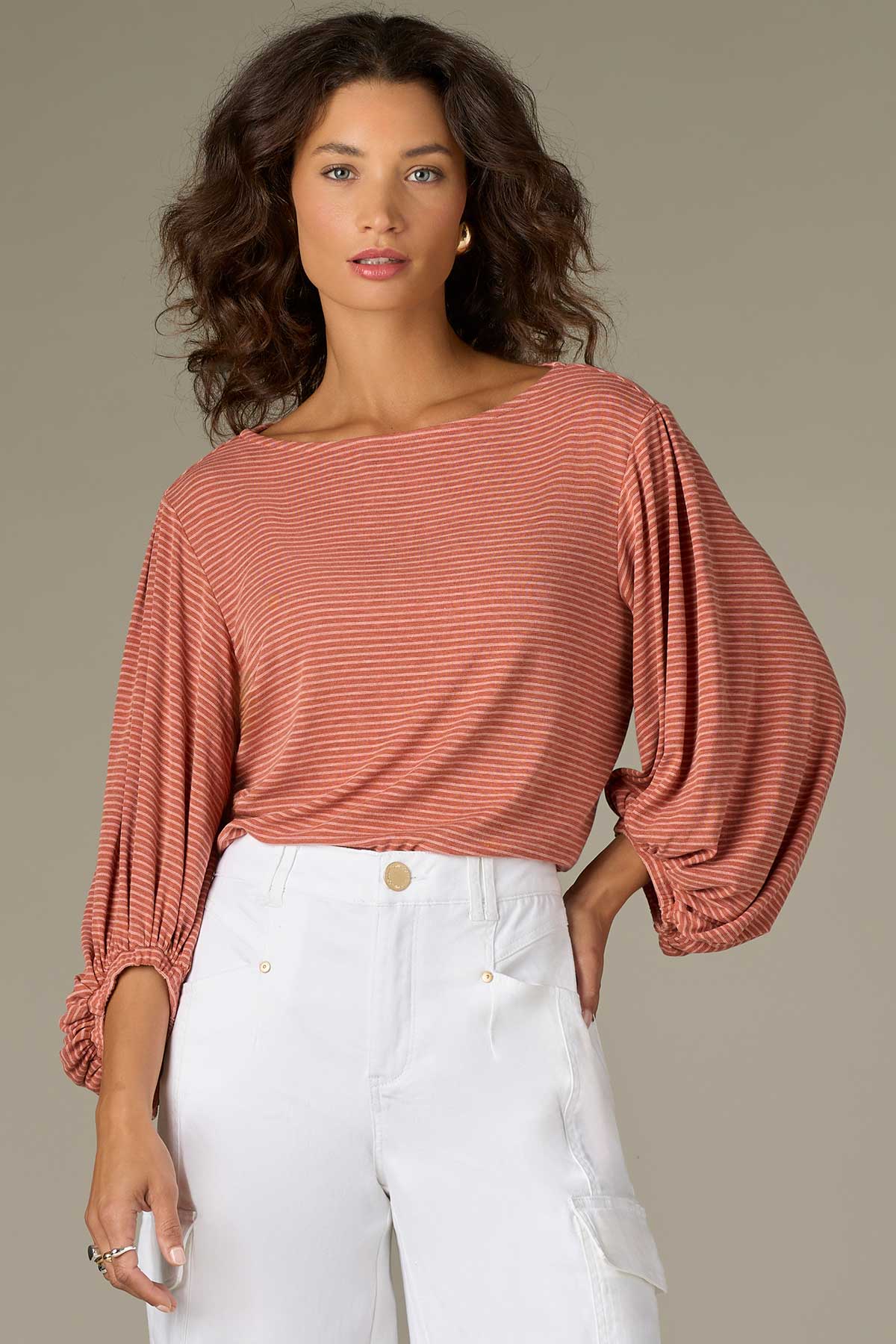 For everyday ease, slip into this flowy knit top in petite sizing. It features three quarter blouson sleeves, a boat neck, and a stripe print --- so versatile, you’ll want one in every color.