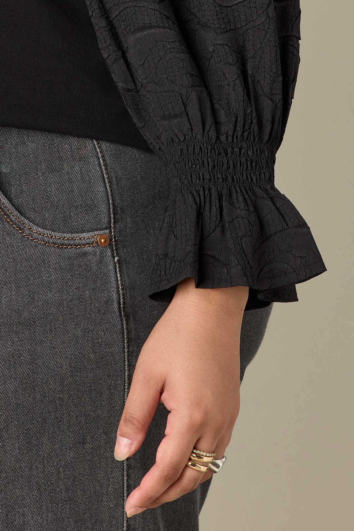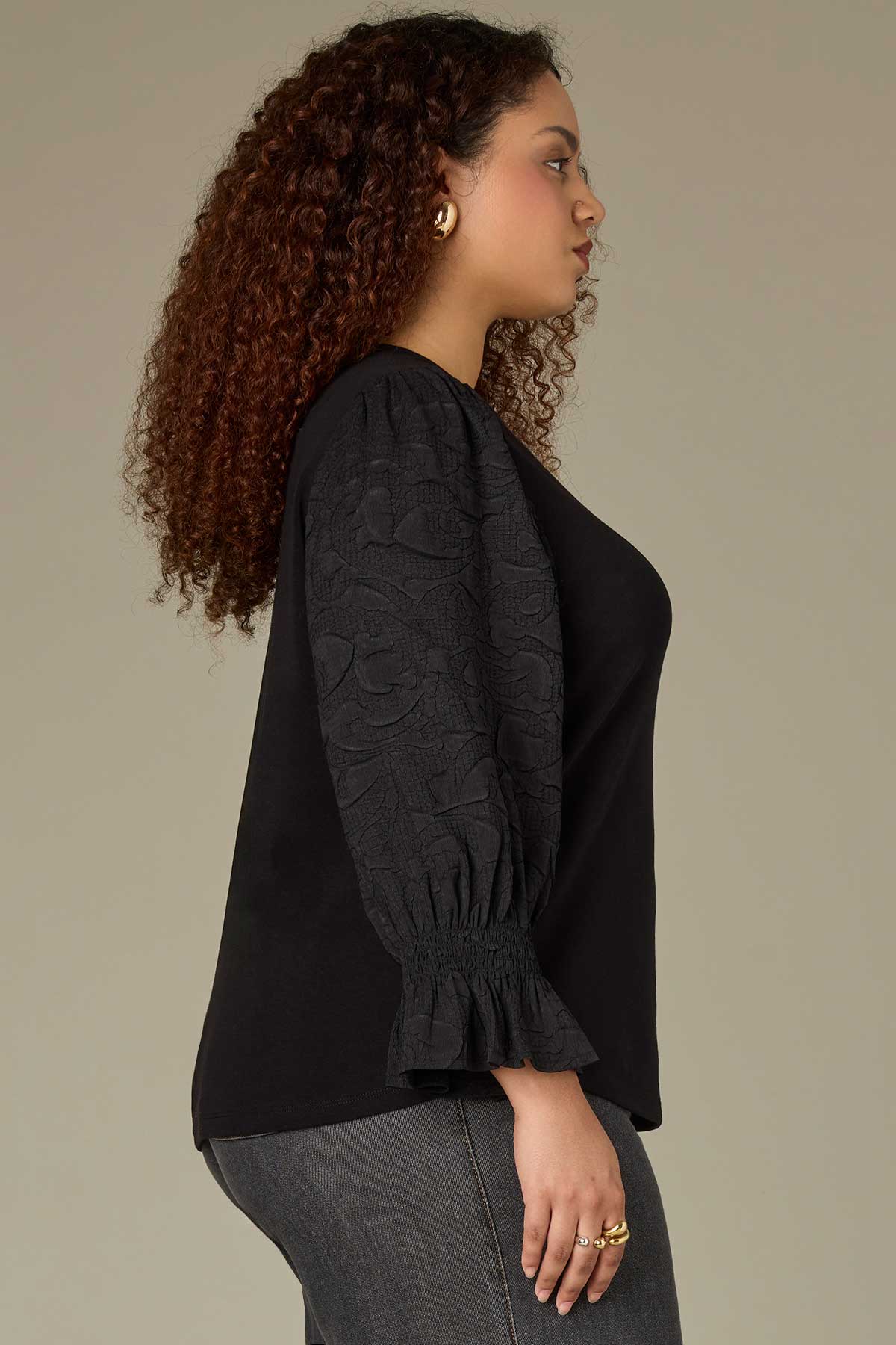 Featuring three quarter smocked flounce sleeves, a round neck, and a hook closure front, this textured mixed media top in plus sizing is made for every day. Available in a timeless black hue and petite sizing.