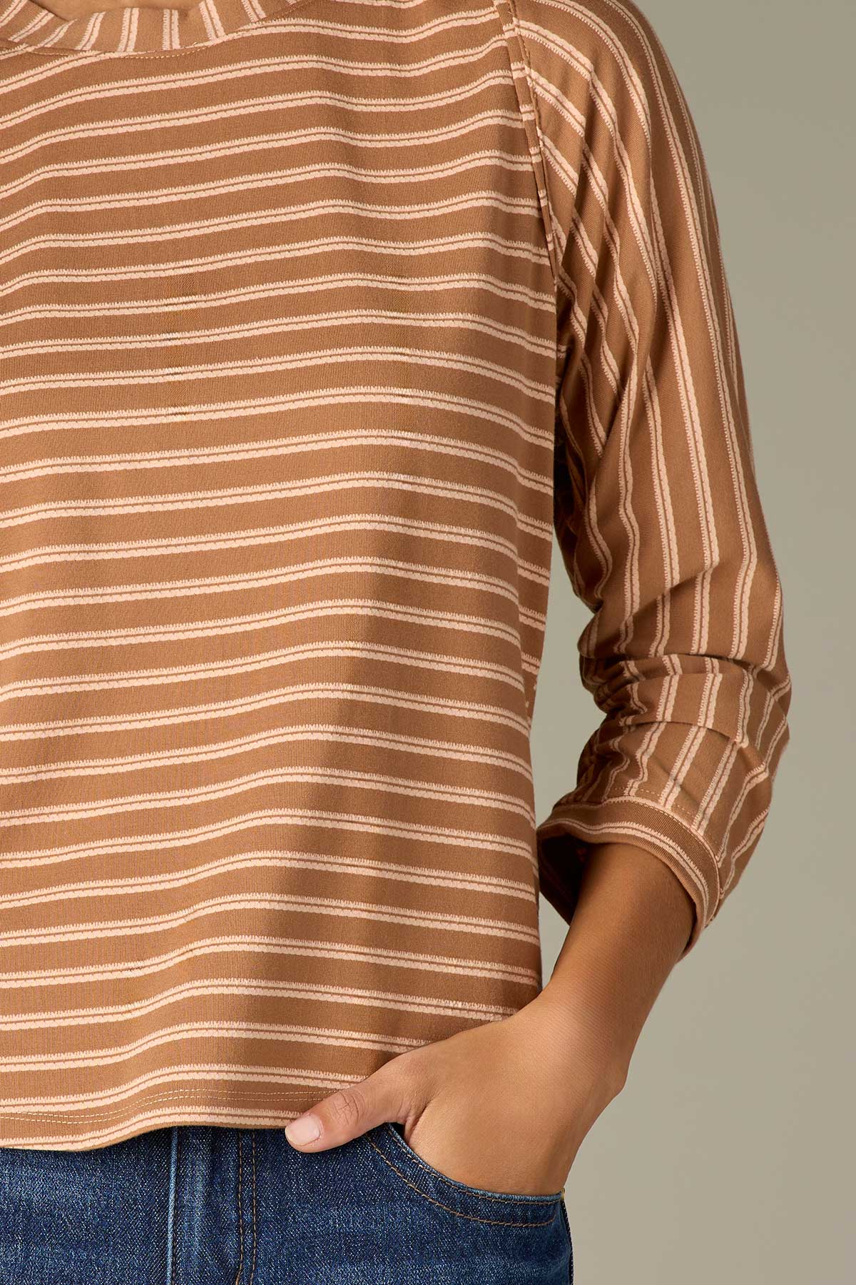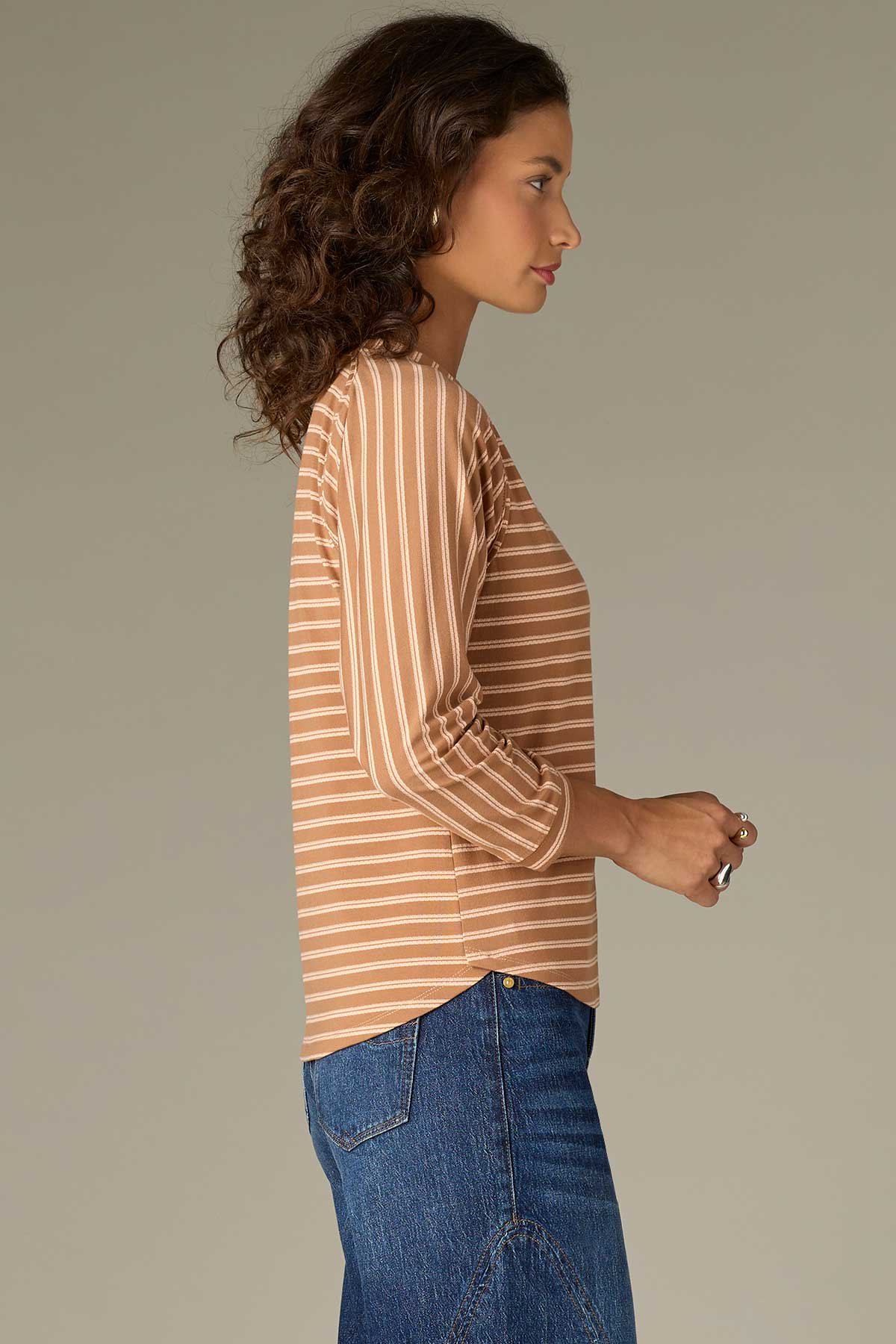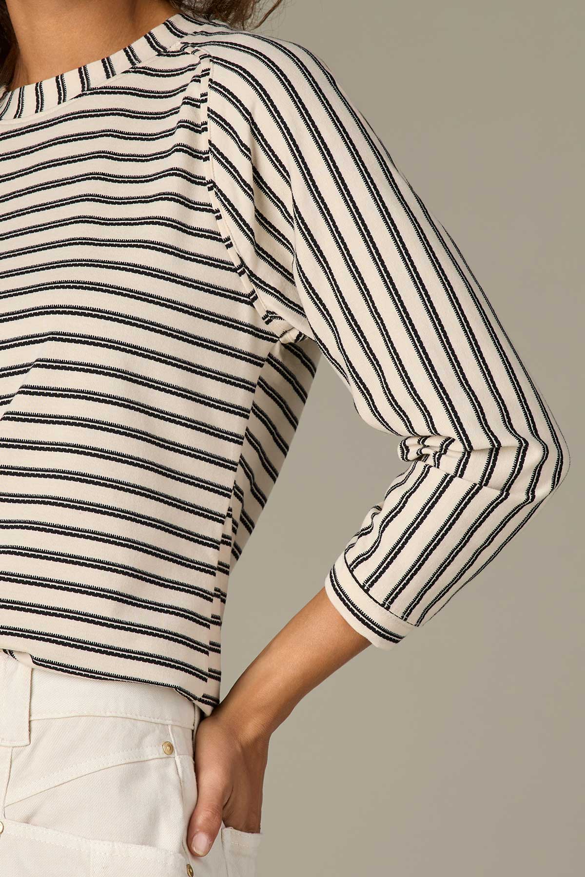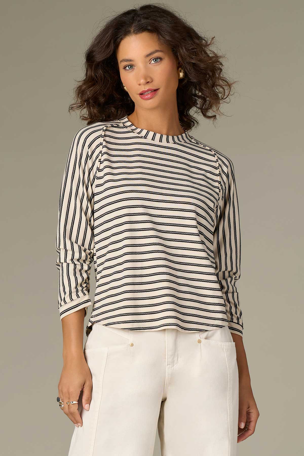 Featuring three quarter French raglan sleeves, a crew neck, and a surplus hem, this striped knit top is an effortless wardrobe addition. Polished, versatile, and made for every day.